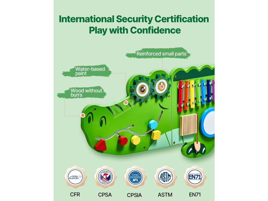 Vyrobená tak, aby vydržala! Vďaka medzinárodnému bezpečnostnému certifikátu je táto nástenná tabuľa na aktivity robustná a bezpečná a vytvára ekologické prostredie na hranie pre vaše dieťatko.