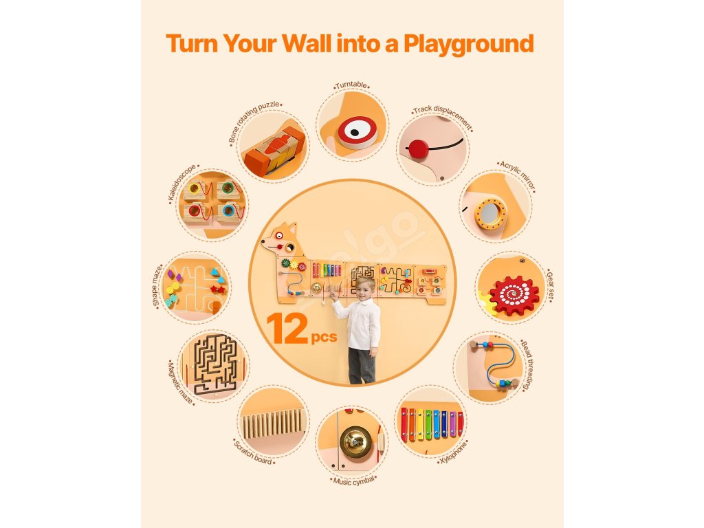 Senzorický nástenný panel je určený na samostatnú alebo skupinovú hru a je ideálny pre rodiny s viacerými deťmi, centrá včasného vzdelávania alebo detské ihriská. Skvelý na podporu samostatnej aj kooperatívnej zábavy!