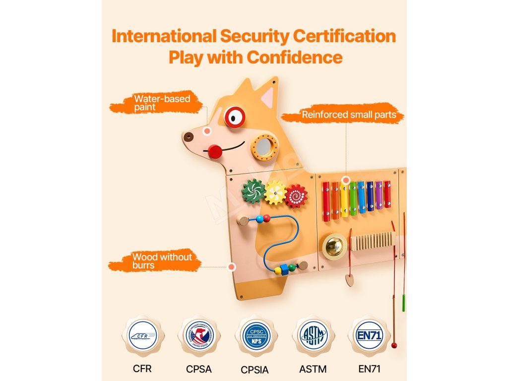 Vyrobená tak, aby vydržala! Vďaka medzinárodnému bezpečnostnému certifikátu je táto nástenná tabuľa na aktivity robustná a bezpečná a vytvára ekologické prostredie na hranie pre vaše dieťatko.