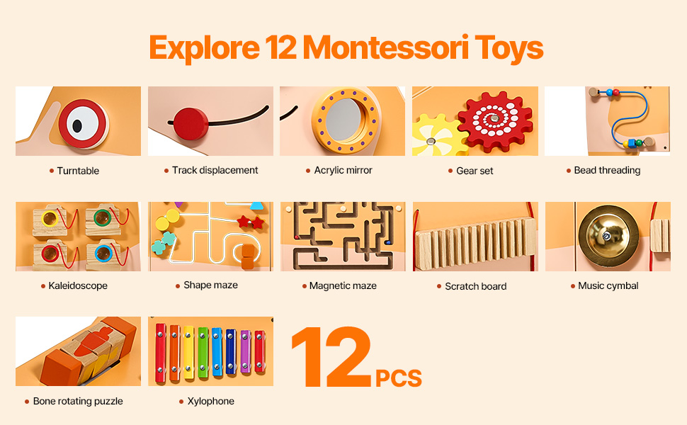 Podporte zvedavosť a učenie vášho dieťaťa pomocou tohto nástenného panelu s aktivitami inšpirovanými metódou Montessori! Náš nástenný panel s aktivitami podporuje skúmanie a zábavu prostredníctvom multisenzorickej hry, ktorá je ideálna pre rozvoj mladých myslí.