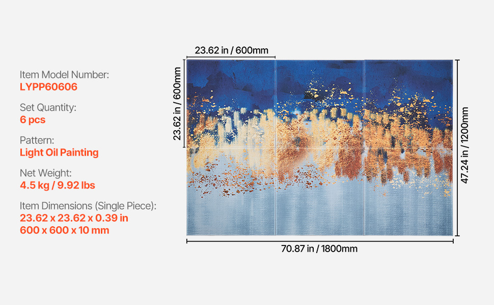 | Rozmery položky (jeden kus) | 600 x 600 x 10 mm / 23,62 x 23,62 x 0,39 palca |