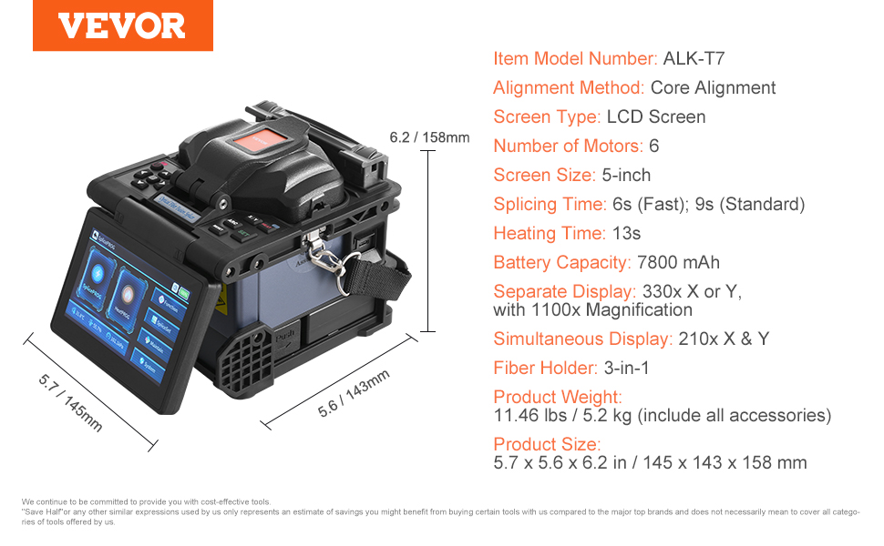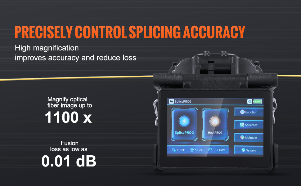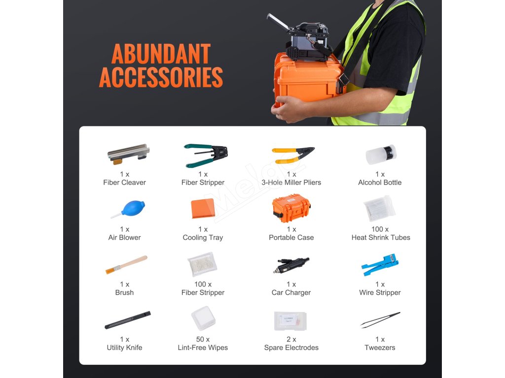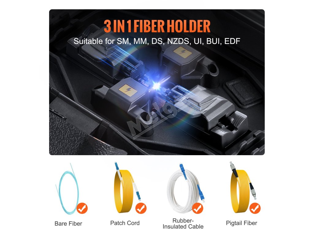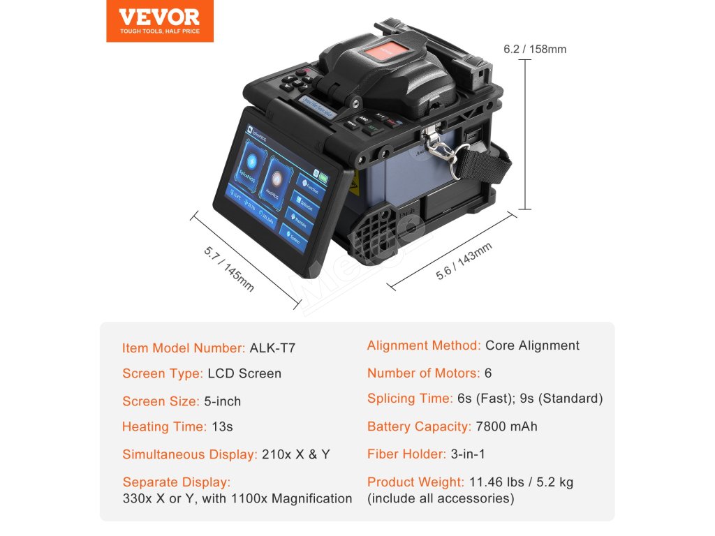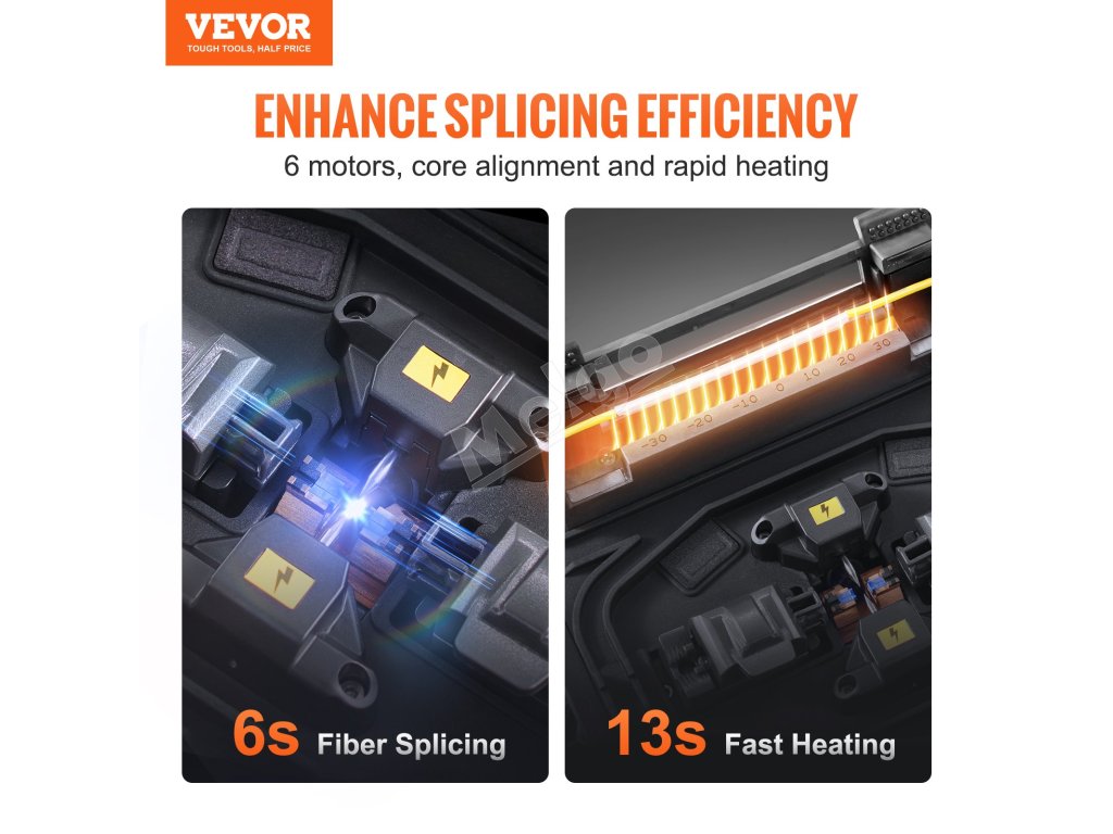 Fúzačka vlákien VEVOR, vybavená technológiou zarovnávania jadier, 6 vysoko presnými motormi, držiakom vlákien 3 v 1, zabezpečuje rýchle spájanie vlákien len za 6 s a rýchle zahrievanie za 13 s. So stratou pri spájaní len 0,01 dB poskytuje jasné a stabilné spoje, vhodné pre širokú škálu projektov optických vlákien.