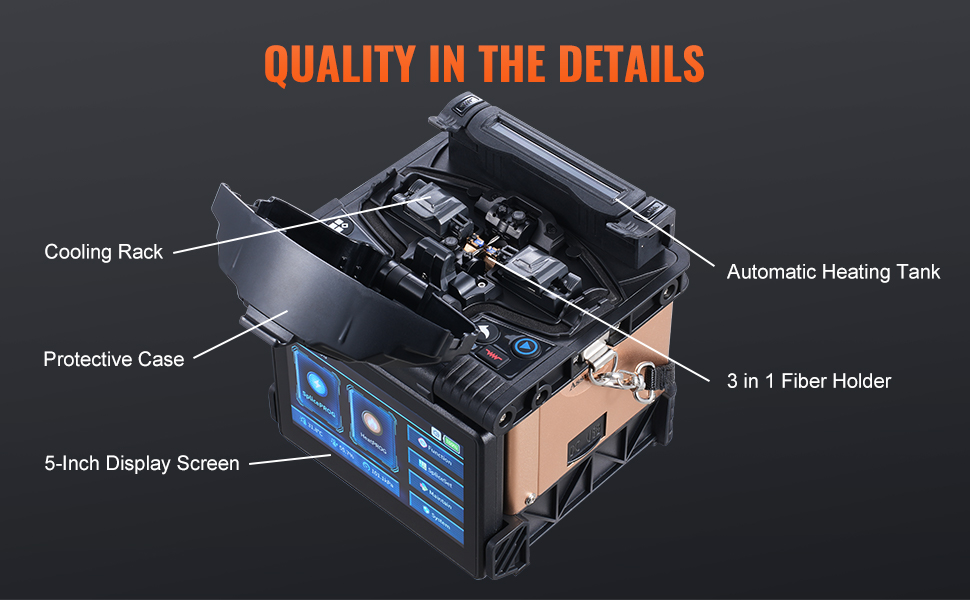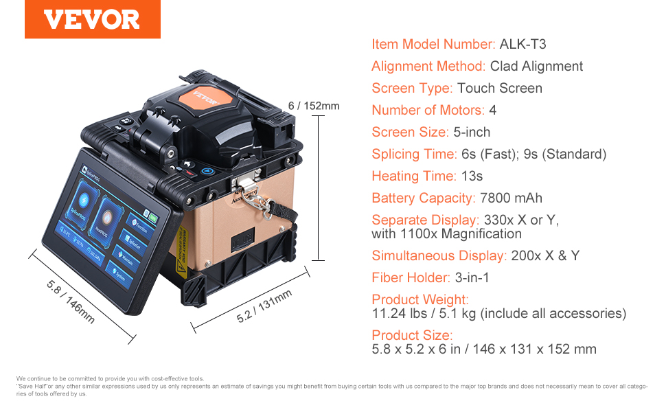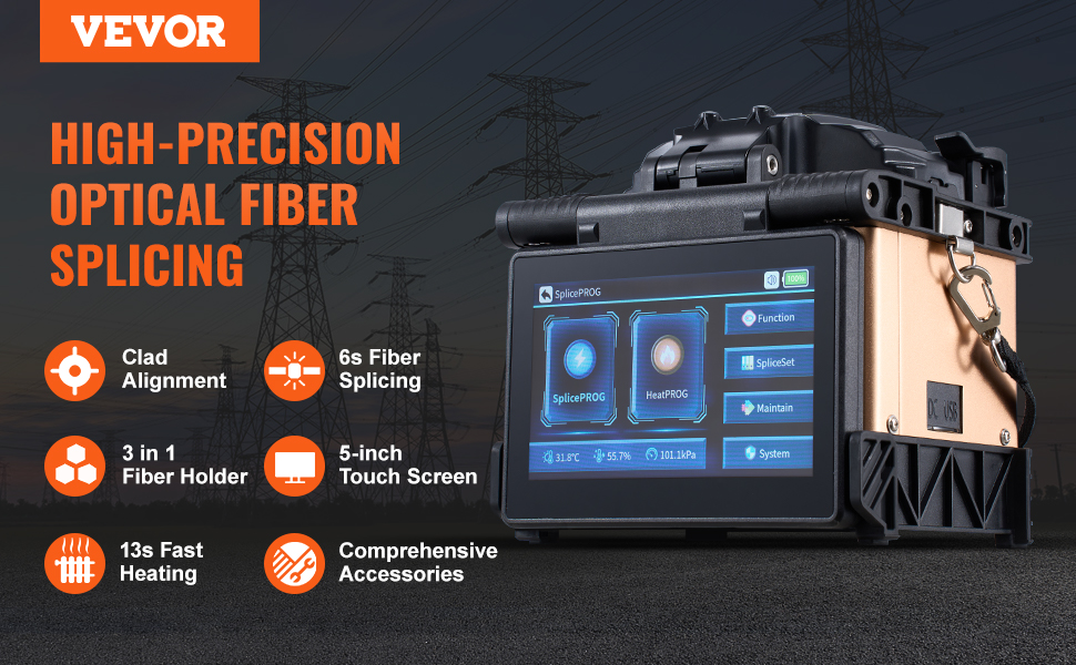 Fúzny spájkovač VEVOR, vybavený technológiou zarovnávania plátov, 4 vysoko presnými motormi, držiakom vlákien 3 v 1, zabezpečuje rýchle spájanie vlákien len za 6 s a rýchle zahrievanie za 13 s. So stratou pri spájaní len 0,01 dB poskytuje jasné a stabilné spoje, vhodné pre širokú škálu projektov optických vlákien.