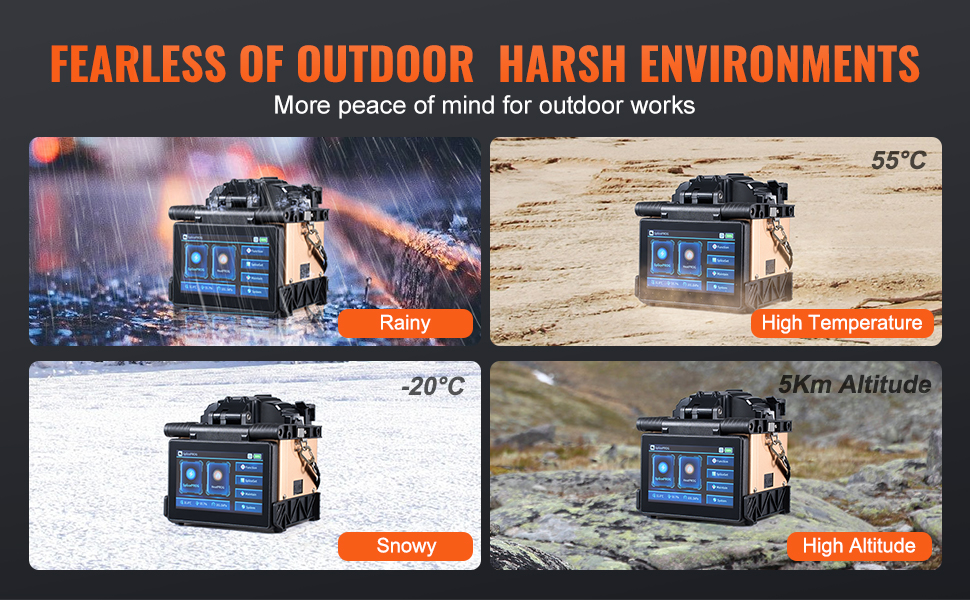 Tento fúzny spájkovač na zarovnávanie plátovaných vlákien navrhnutý so zosilnenou ochranou spoľahlivo funguje v extrémnych podmienkach vrátane dažďa, vysokých teplôt, snehových búrok a vysokých nadmorských výšok, takže je ideálny na náročné vonkajšie aplikácie.