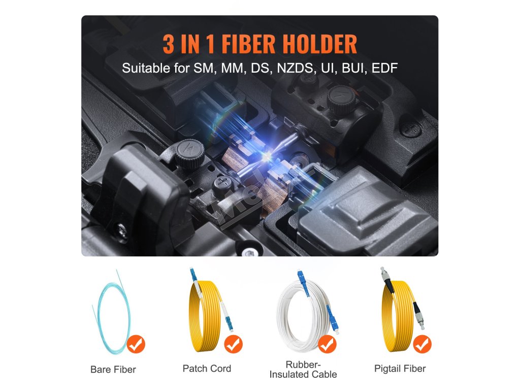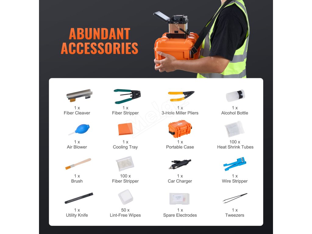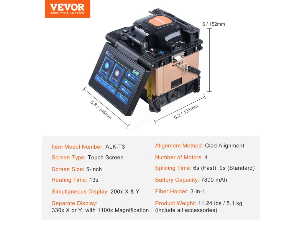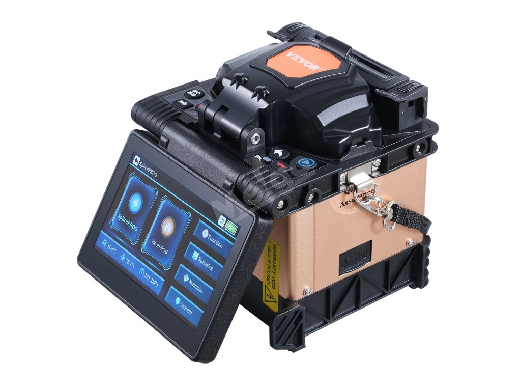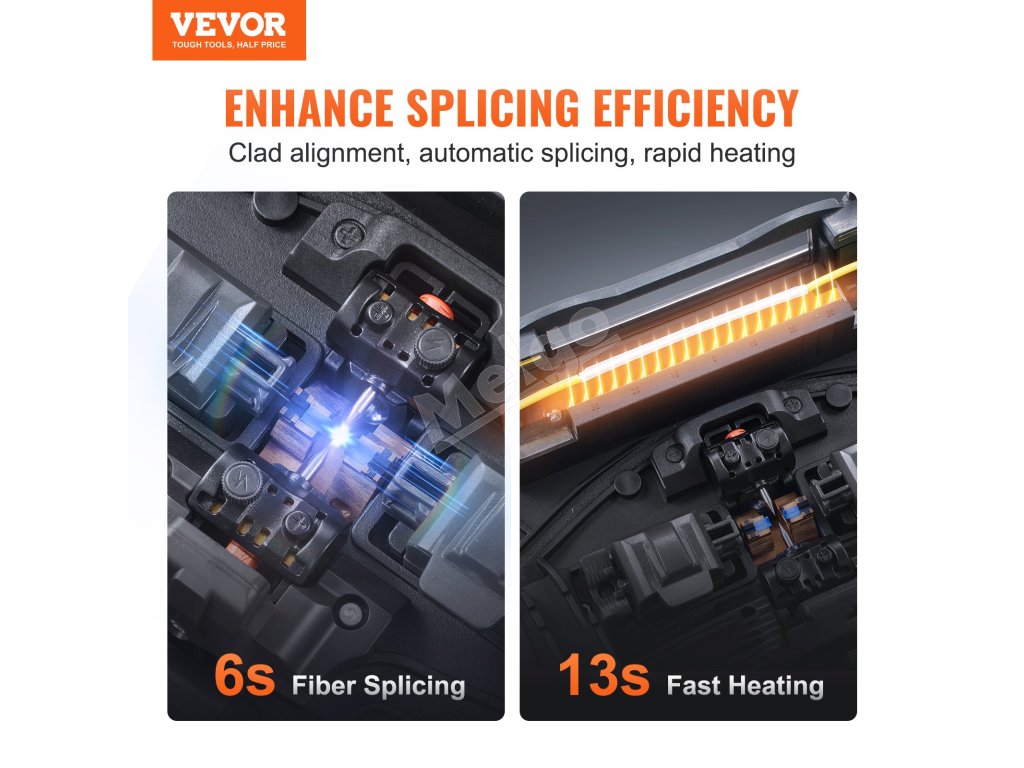 Fúzny spájkovač VEVOR, vybavený technológiou zarovnávania plátov, 4 vysoko presnými motormi, držiakom vlákien 3 v 1, zabezpečuje rýchle spájanie vlákien len za 6 s a rýchle zahrievanie za 13 s. So stratou pri spájaní len 0,01 dB poskytuje jasné a stabilné spoje, vhodné pre širokú škálu projektov optických vlákien.