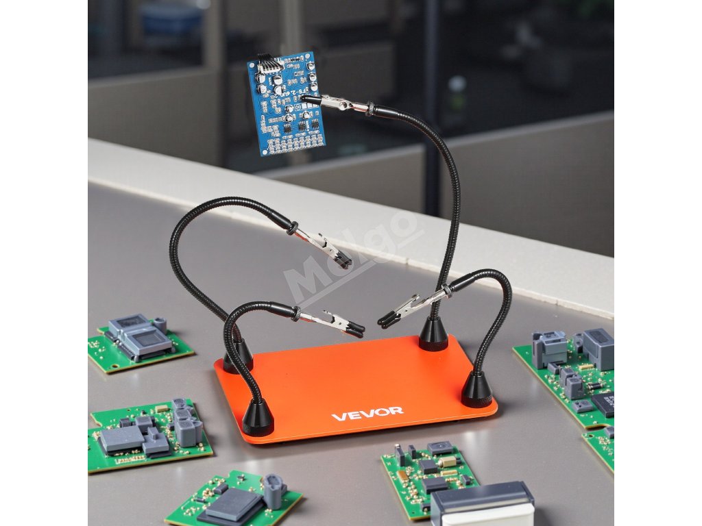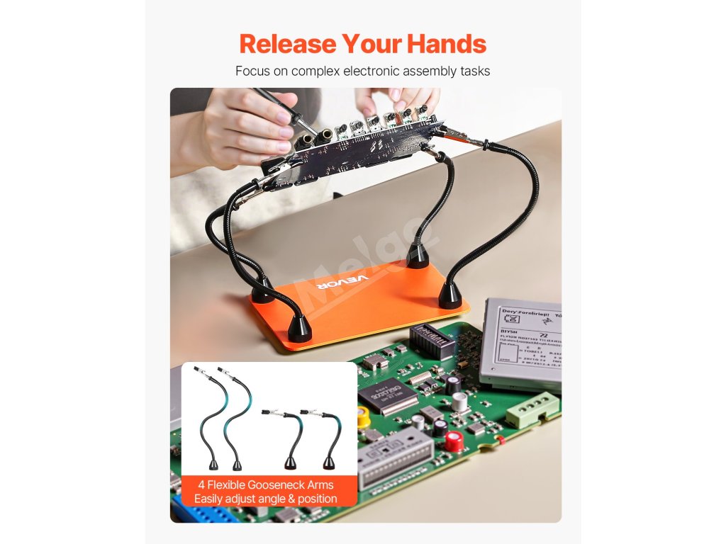 Naše pomocné ruky na spájkovanie majú 4 flexibilné ramená, ktoré sa dajú voľne ohýbať o 360°, čo umožňuje jednoduché nastavenie uhla a výšky na presné umiestnenie súčiastok. Sú ideálne na projekty akejkoľvek veľkosti, úplne uvoľnia vaše ruky a zefektívnia prácu.