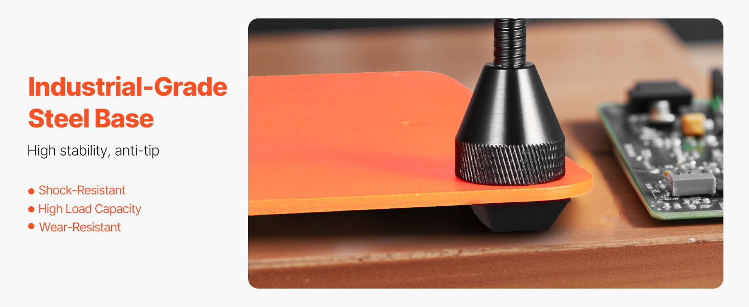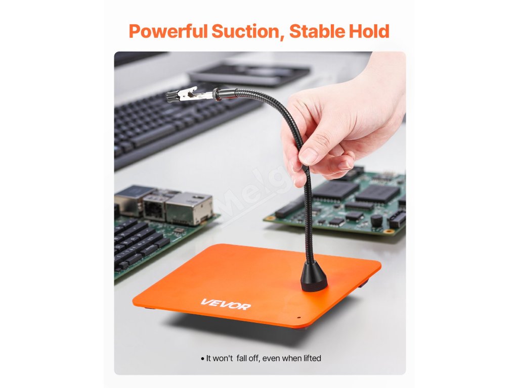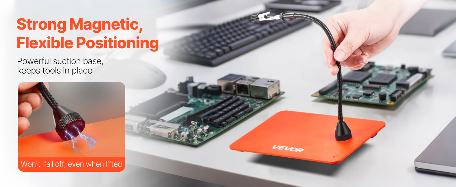 Základňa ramena s husím krkom je vybavená silnou magnetickou príťažlivosťou, vďaka ktorej sa bezpečne pripevní k pracovnej ploche. Toto náradie s pomocnými rukami teda zabraňuje posunu počas práce, znižuje riziko skĺznutia alebo prevrátenia náradia a umožňuje rýchle nastavenie, čím zvyšuje efektivitu práce.