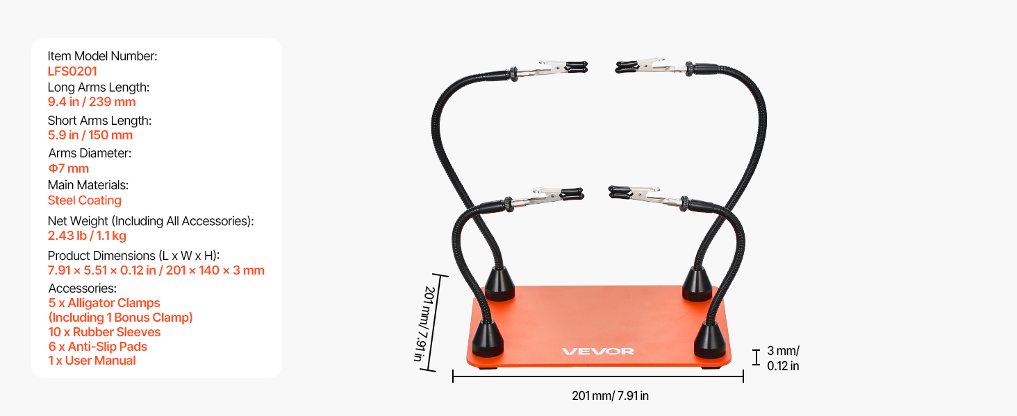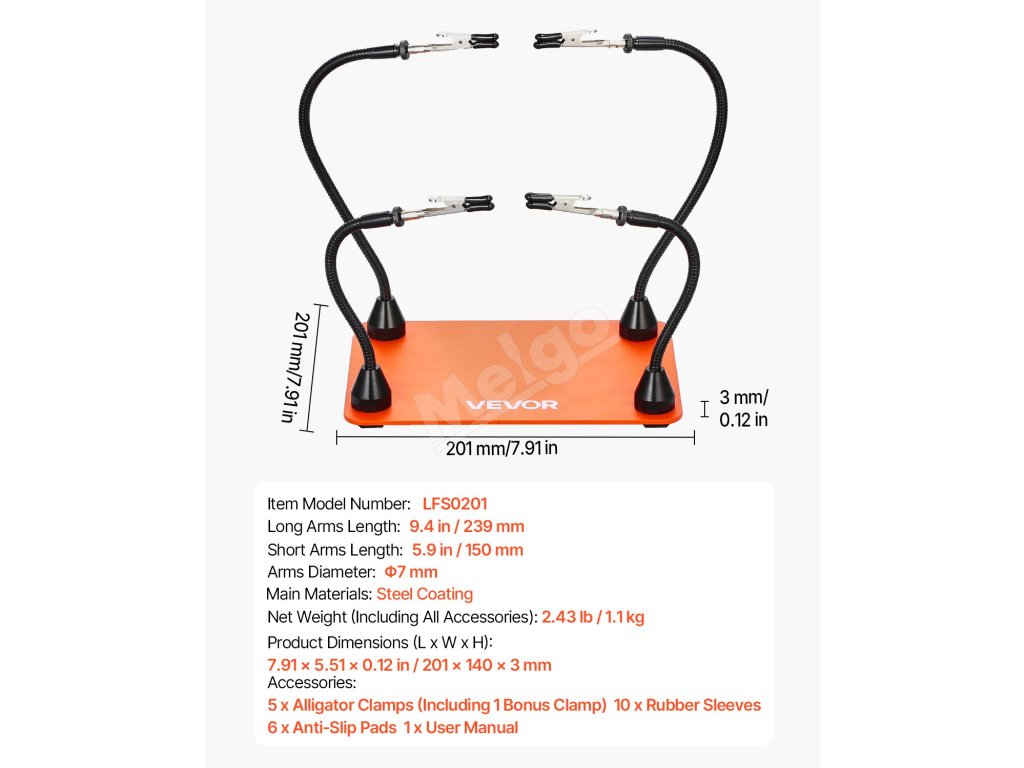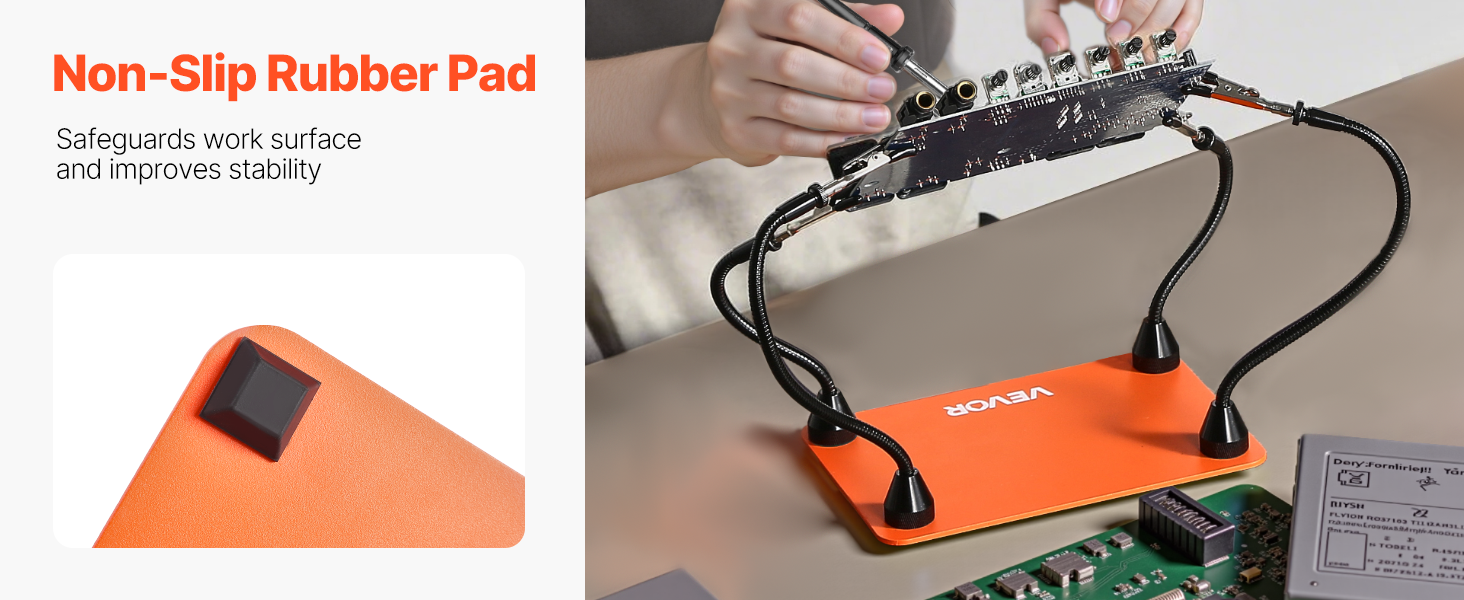 Toto náradie tretej ruky sa dodáva s protišmykovými gumovými podložkami, ktoré poskytujú vysoké trenie, účinne zabraňujú posúvaniu zariadenia a zabezpečujú stabilitu počas používania. Mäkký gumový materiál odolný proti opotrebovaniu tiež zabraňuje poškriabaniu a poškodeniu pracovného povrchu.