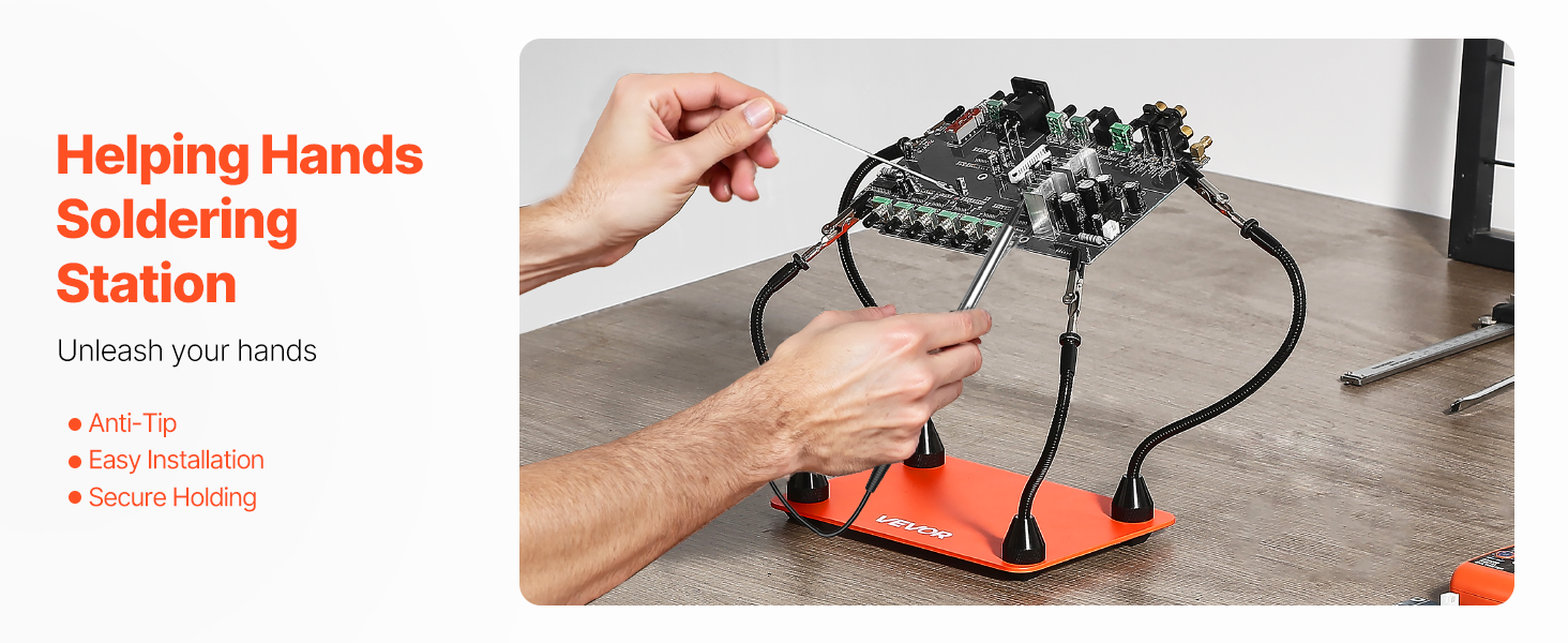 Táto spájkovacia stanica s pomocnými rukami je vhodná na širokú škálu úloh vrátane elektroniky, práce s plošnými spojmi, elektroinštalácie, vitráží, umeleckých remesiel a iných precíznych projektov.