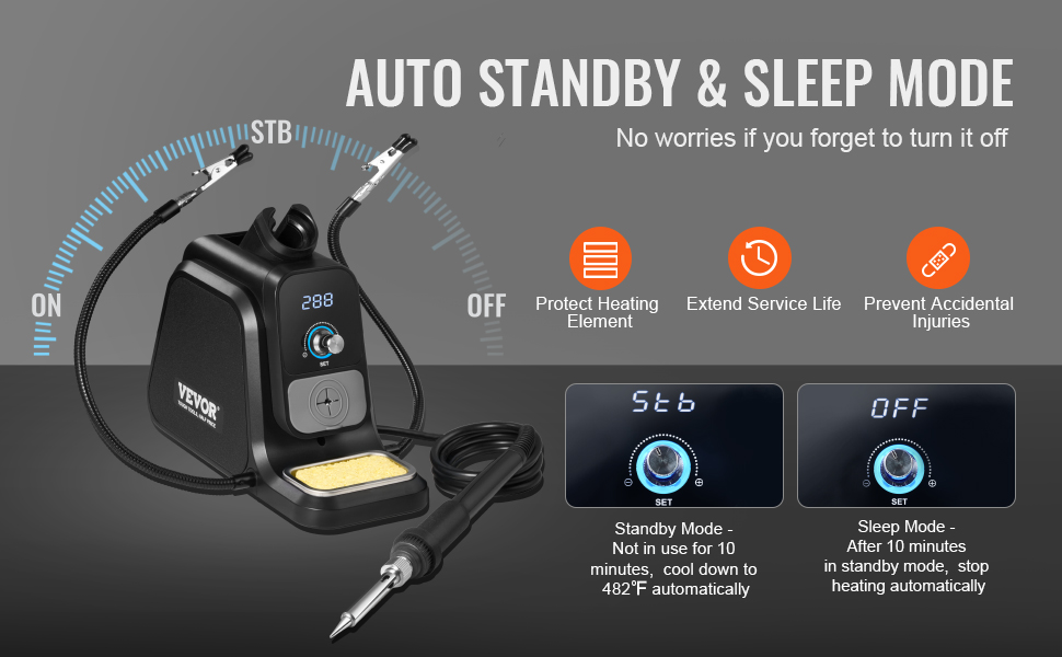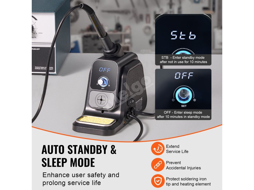 Automatický pohotovostný režim a režim spánku zaisťujú bezpečnosť vašej spájkovacej práce! Premyslené funkcie nielenže chránia vykurovacie teleso a predlžujú životnosť stanice, ale pomáhajú aj predchádzať náhodným popáleninám, čím poskytujú bezpečnejšie a efektívnejšie spájkovanie.