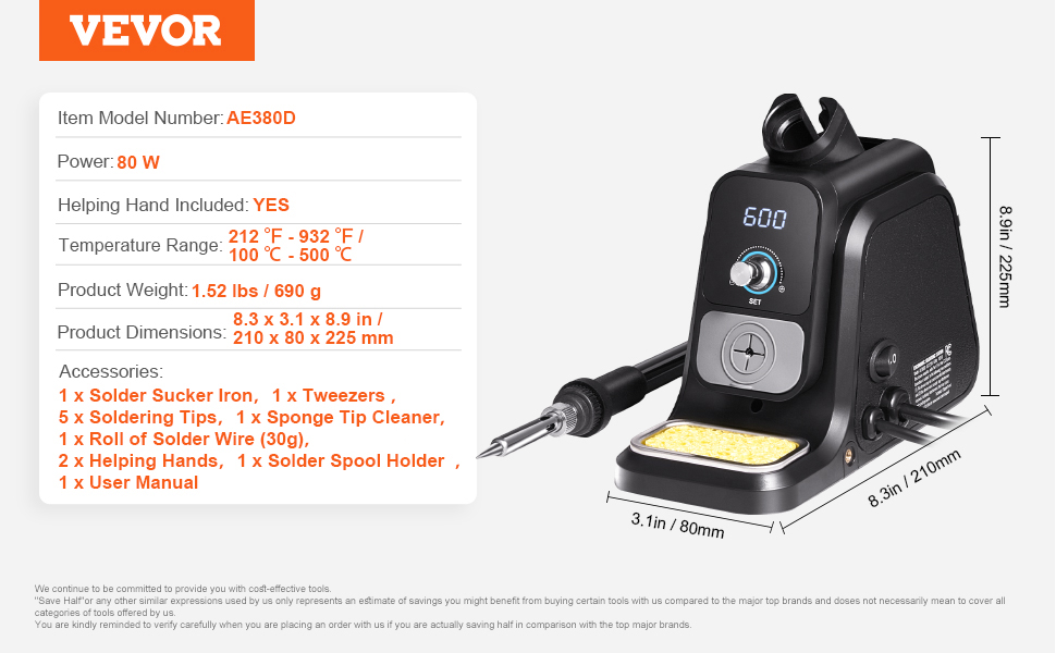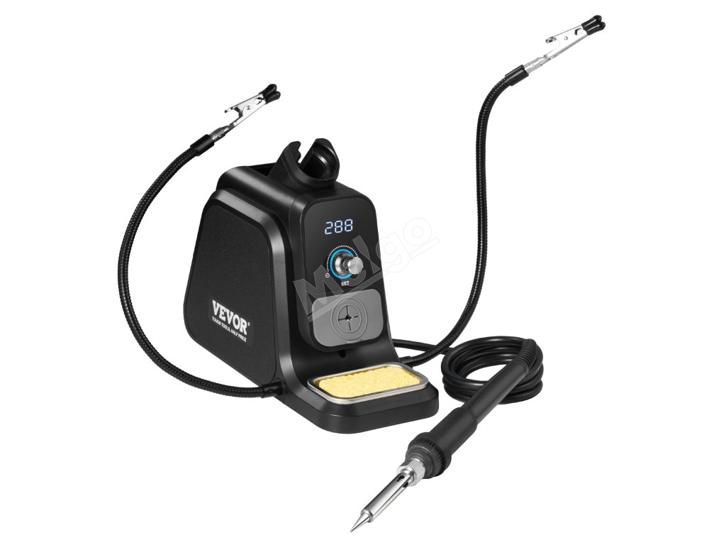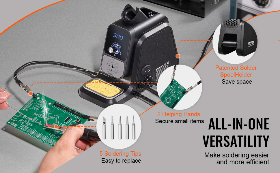 Táto spájkovacia pracovná stanica je vybavená patentovaným držiakom spájkovacej cievky, ktorý udržiava spájkovací drôt bezpečne na mieste pre jednoduchšiu prácu. Vďaka 2 pomocným rukám, ktoré stabilne držia predmety a uvoľňujú ruky, a 5 univerzálnym spájkovacím hrotom, ktoré sa dajú ľahko vymeniť, spĺňa rôzne potreby.