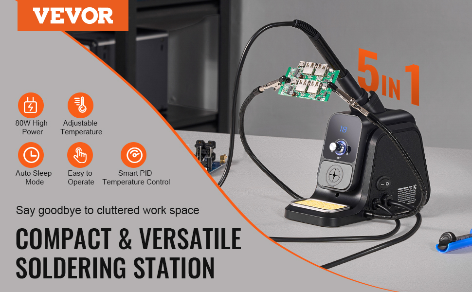 Kompaktné a všestranné riešenie "všetko v jednom" na spájkovanie! Táto spájkovacia stanica 5 v 1 kombinuje 80W vysoký výkon, nastaviteľnú teplotu, inteligentnú PID reguláciu teploty a automatický režim spánku v jednom zariadení. Rozlúčte sa s neprehľadným pracovným priestorom a užite si efektívne spájkovanie.