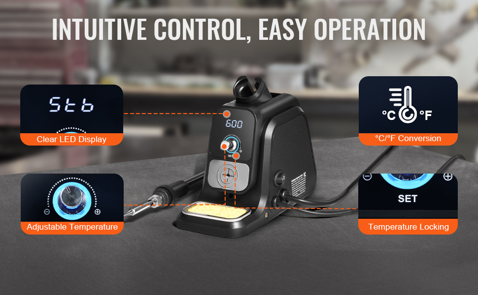 Túto digitálnu spájkovaciu stanicu zapnete a nastavíte teplotu jednoduchým otočením gombíka. Vďaka digitálnemu displeju LED je nastavenie teploty hračkou a prepínateľné režimy ℃/℉ zvyšujú pohodlie - stačí ju zapojiť a začať spájkovať!