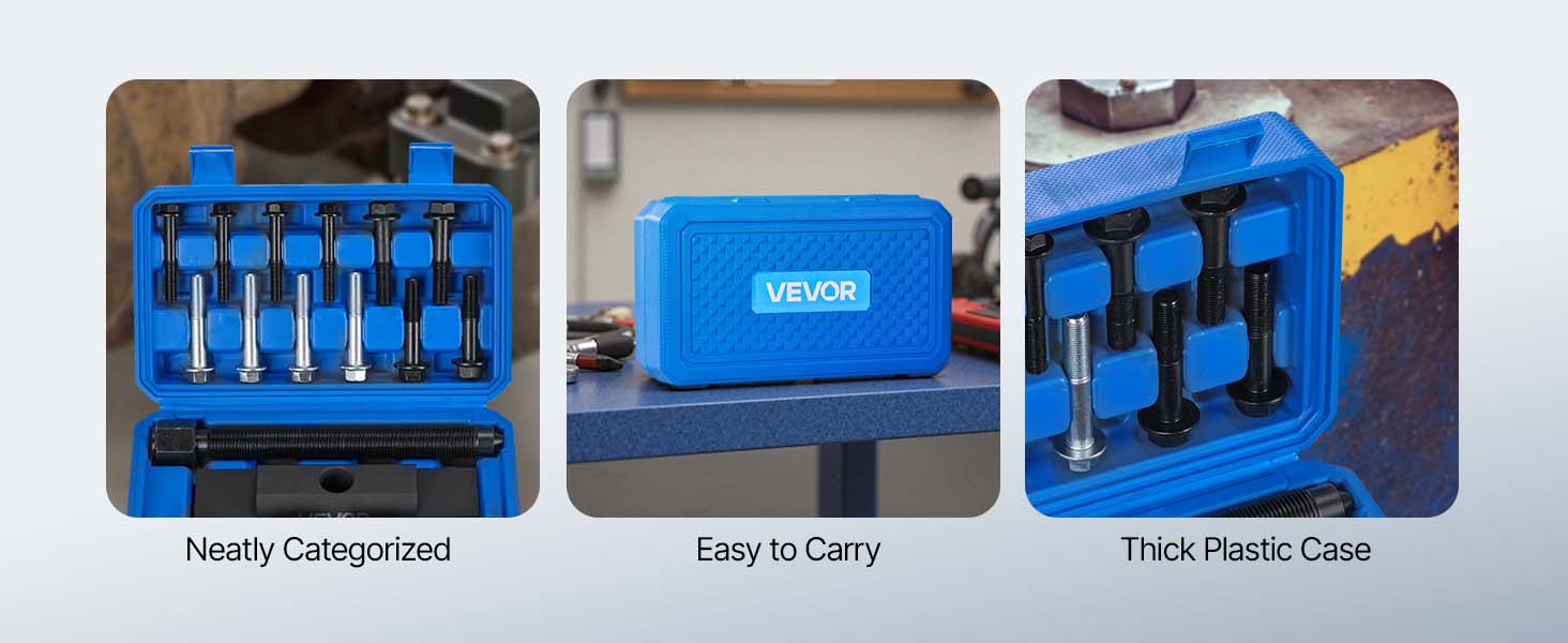 Všetky diely našej súpravy nástrojov na demontáž ťažkého jarma sú prehľadne uložené v plastovom puzdre odolnom voči prachu na ľahký prístup, skladovanie a prepravu - už žiadne chýbajúce diely.
