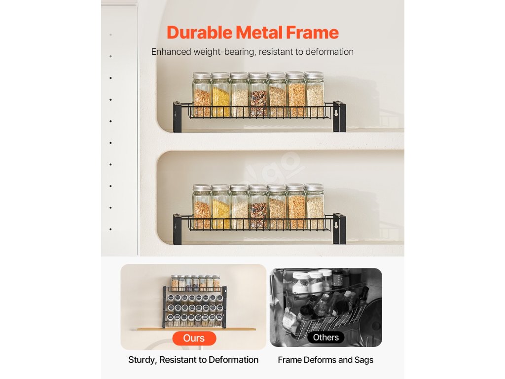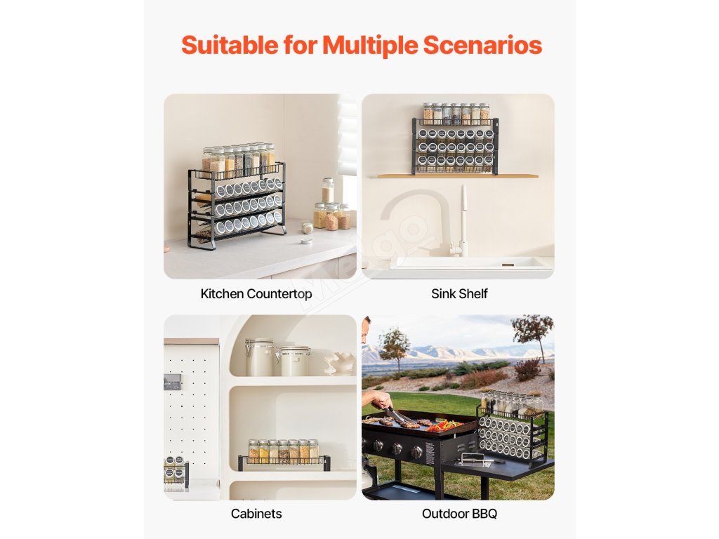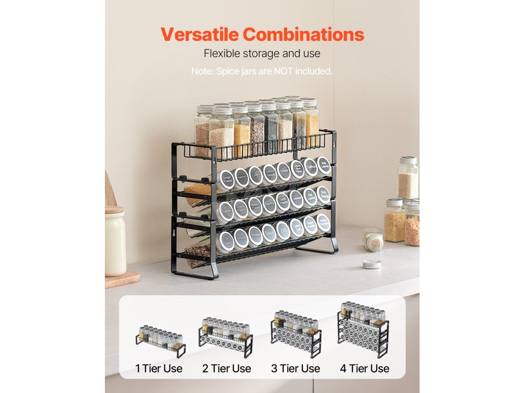 Viacúrovňová štruktúra úhľadne usporiada a vystaví vaše fľaše s korením, čím sa zníži neporiadok a zároveň sa maximalizuje priestor na pracovnej doske na každodenné varenie a iné činnosti.