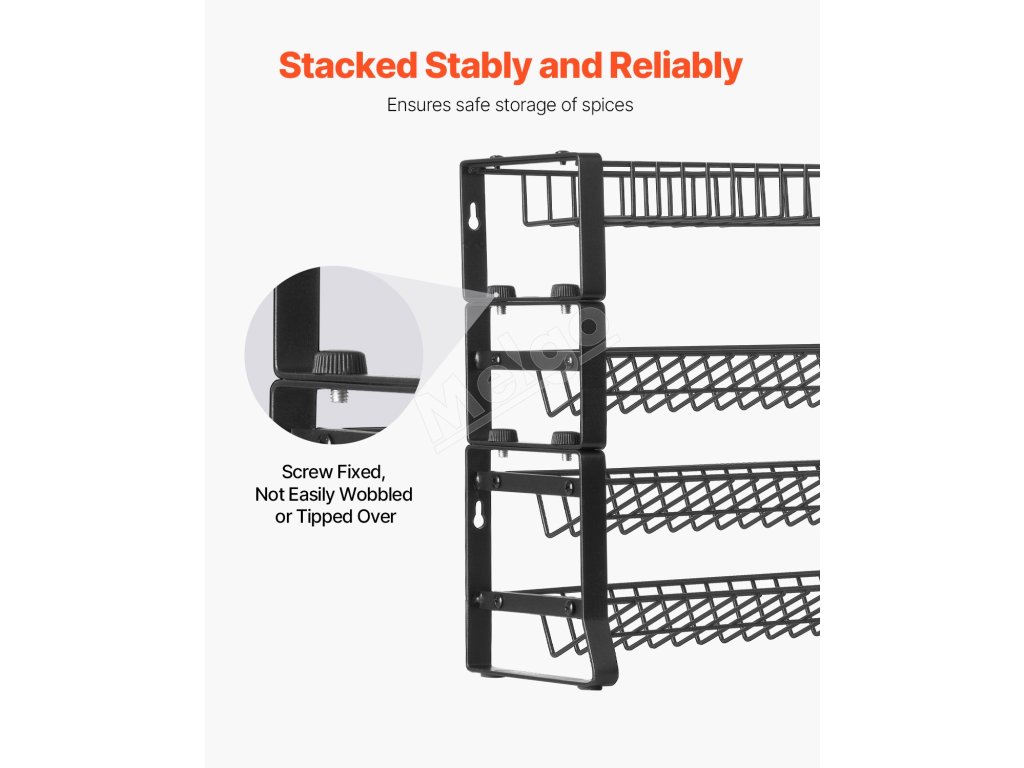 Organizér na korenie má stohovateľnú konštrukciu, ktorá ponúka veľkú flexibilitu a praktickosť. Dvojúrovňový hlavný stojan poskytuje priestranný úložný priestor na korenie, zatiaľ čo ďalšie 2 jednoúrovňové stojany možno podľa potreby pridať alebo používať samostatne.