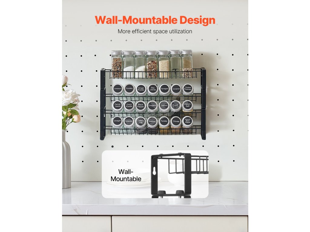 Táto priestorovo úsporná súprava na uskladnenie korenín podporuje inštaláciu na pracovnú dosku aj na stenu. Umiestnite ju na pracovnú dosku, aby ste ušetrili miesto v skrinke, alebo ju pripevnite na stenu, aby ste naplno využili vertikálny priestor a udržali pracovnú dosku upratanú a organizovanú.