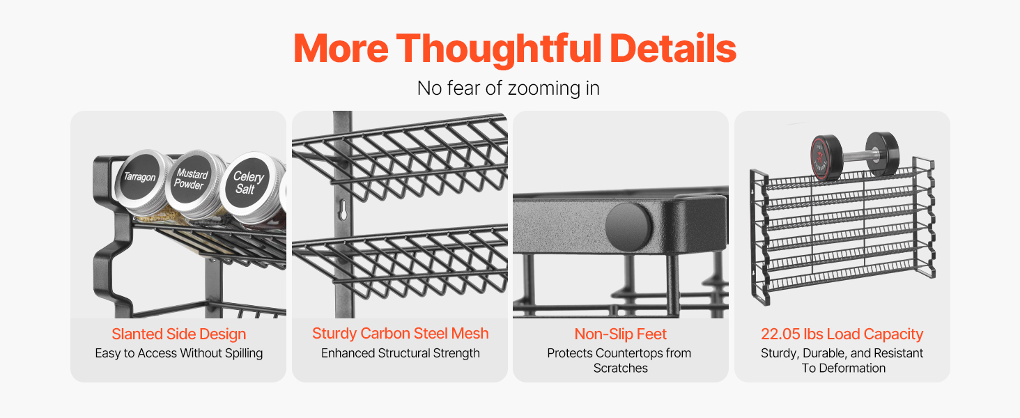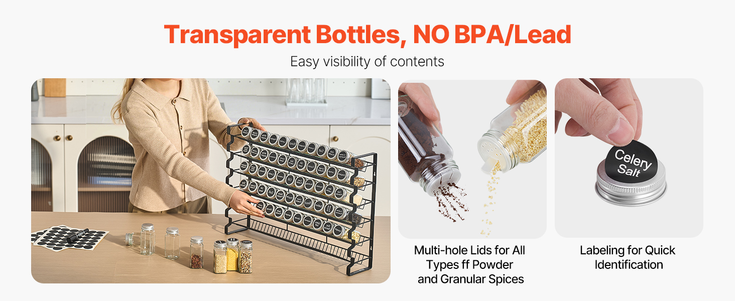 Viacúrovňová štruktúra úhľadne usporiada a vystaví vaše fľaše s korením, čím sa zníži neporiadok a zároveň sa maximalizuje priestor na pracovnej doske na každodenné varenie a iné činnosti.