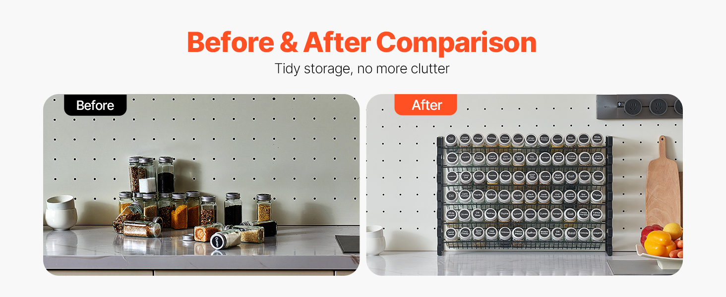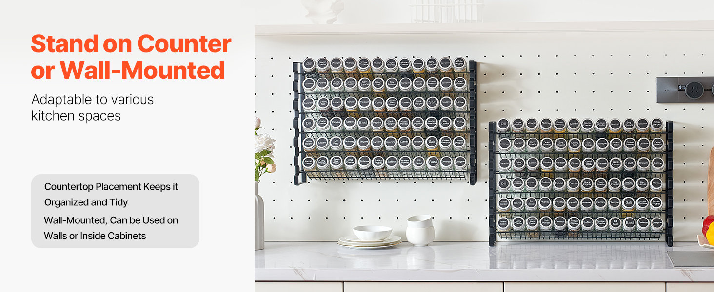 Táto priestorovo úsporná súprava na uskladnenie korenín podporuje inštaláciu na pracovnú dosku aj na stenu. Umiestnite ju na pracovnú dosku, aby ste ušetrili miesto v skrinke, alebo ju pripevnite na stenu, aby ste naplno využili vertikálny priestor a udržali pracovnú dosku upratanú a organizovanú.