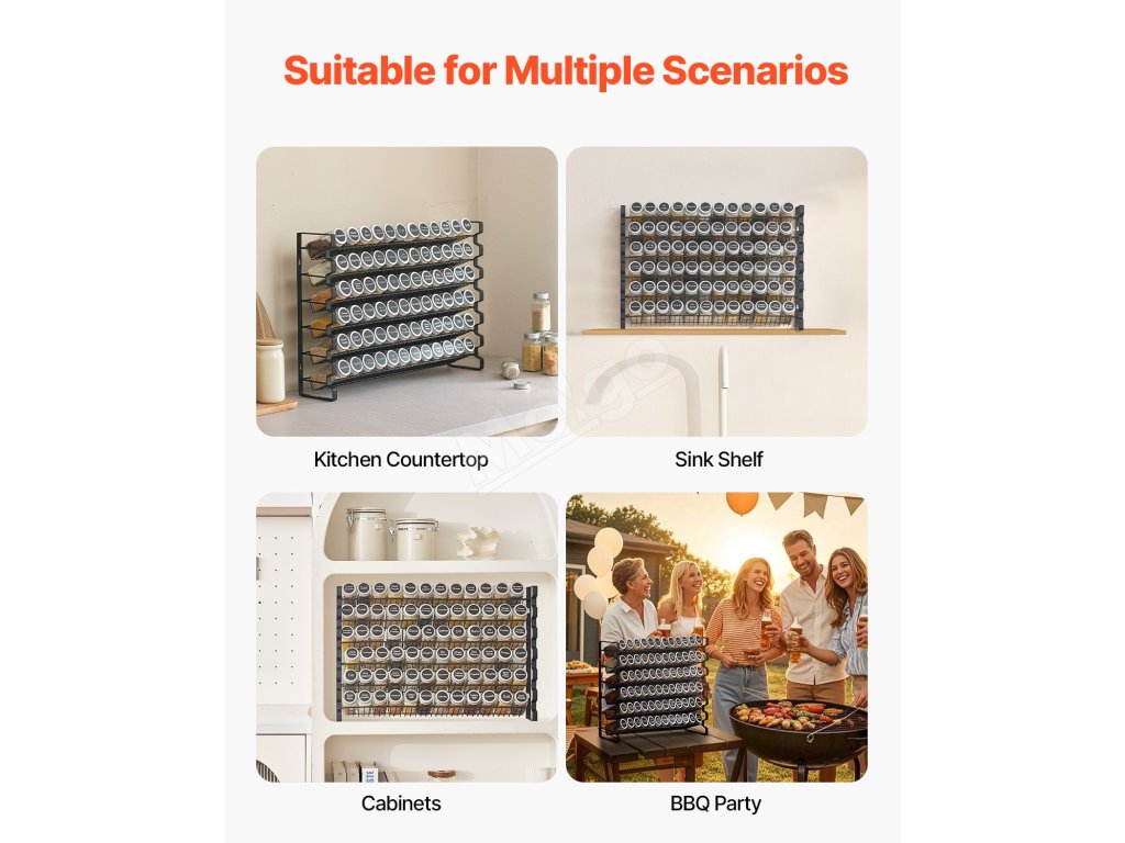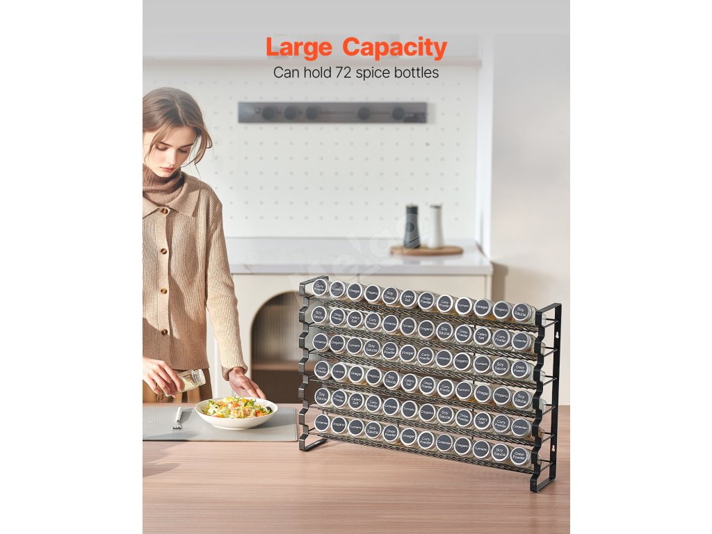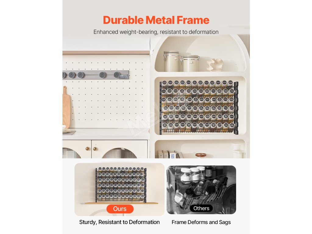 Viacúrovňová štruktúra úhľadne usporiada a vystaví vaše fľaše s korením, čím sa zníži neporiadok a zároveň sa maximalizuje priestor na pracovnej doske na každodenné varenie a iné činnosti.