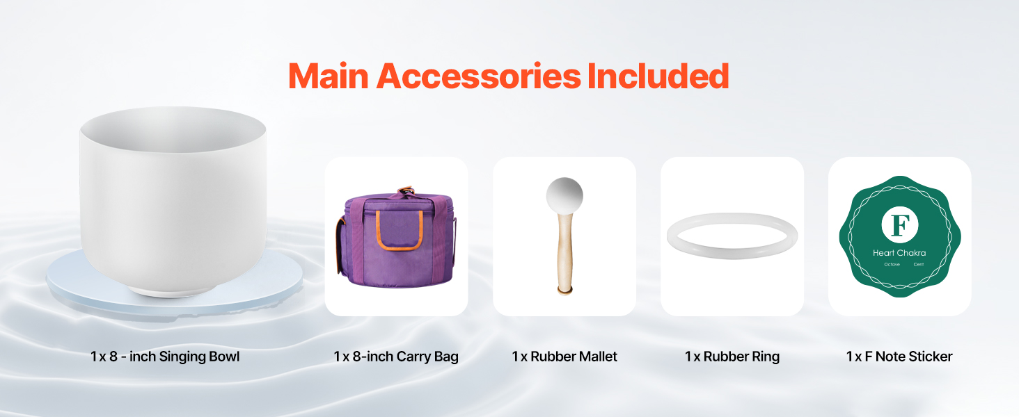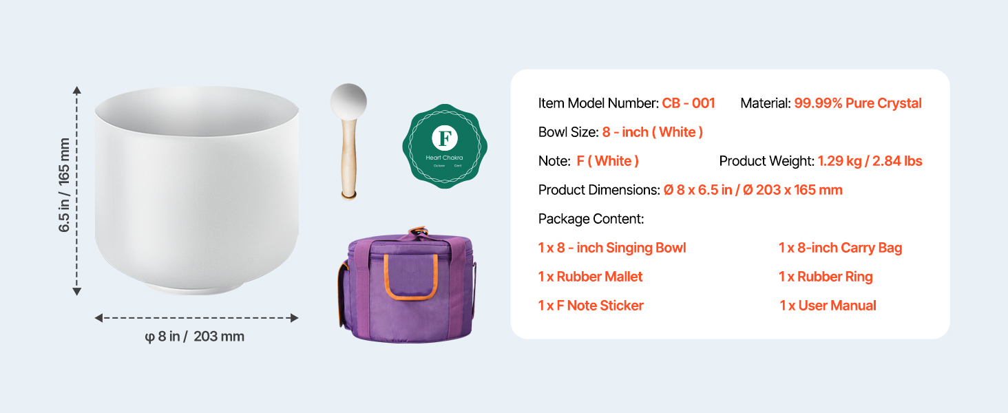 Táto súprava, vybavená 1 x 8-palcovou spievajúcou miskou, 1 x gumovou paličkou, 1 x gumovým krúžkom, 1 x nálepkou s notami F a 1 x prenosnou taškou, zaručuje bezproblémový a relaxačný zážitok z liečenia zvukom, či už doma alebo na cestách.