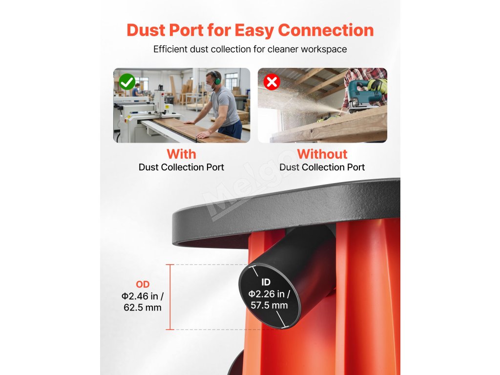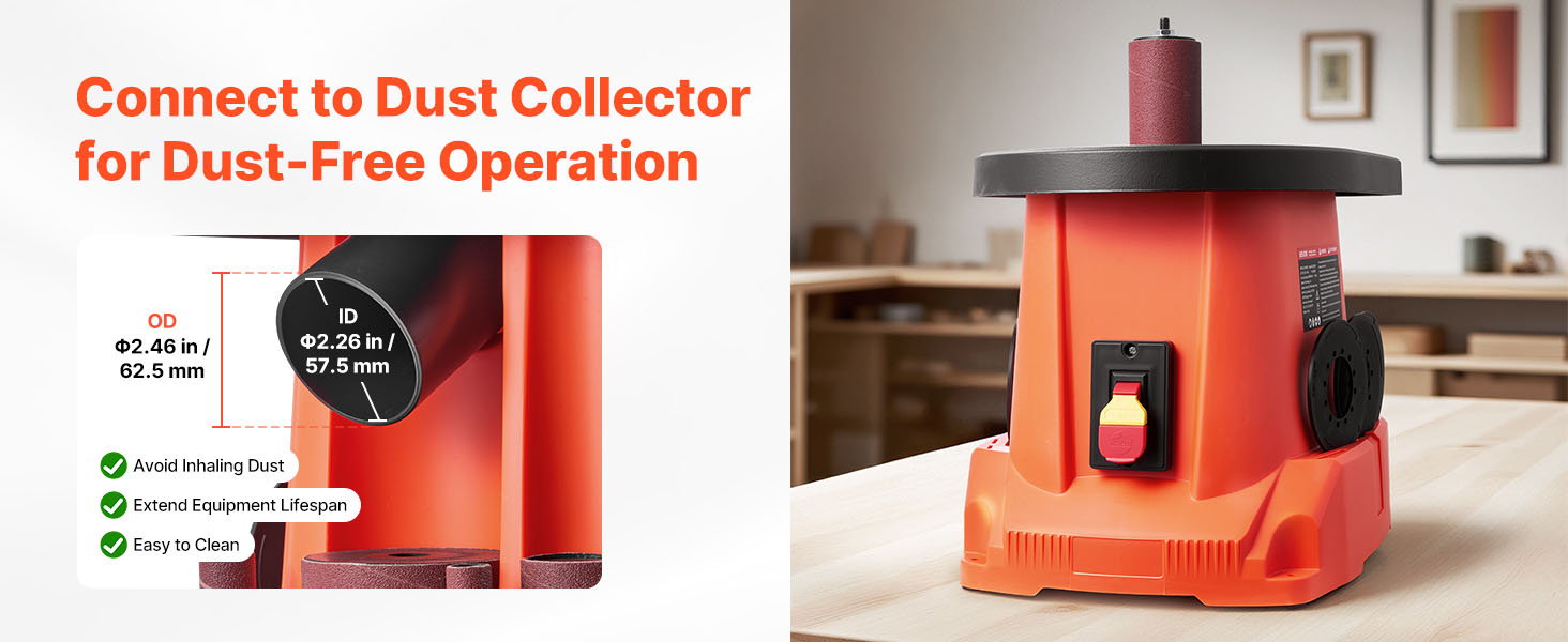 Vretenová brúska je vybavená prachovým otvorom s priemerom 57,5 mm (ID) a 62,5 mm (OD), vďaka čomu ju možno ľahko pripojiť k vysávacím hadiciam na bezprašnú prevádzku, čím sa znižuje množstvo čistiacich prác, predlžuje životnosť zariadenia a udržiava čistý pracovný priestor.