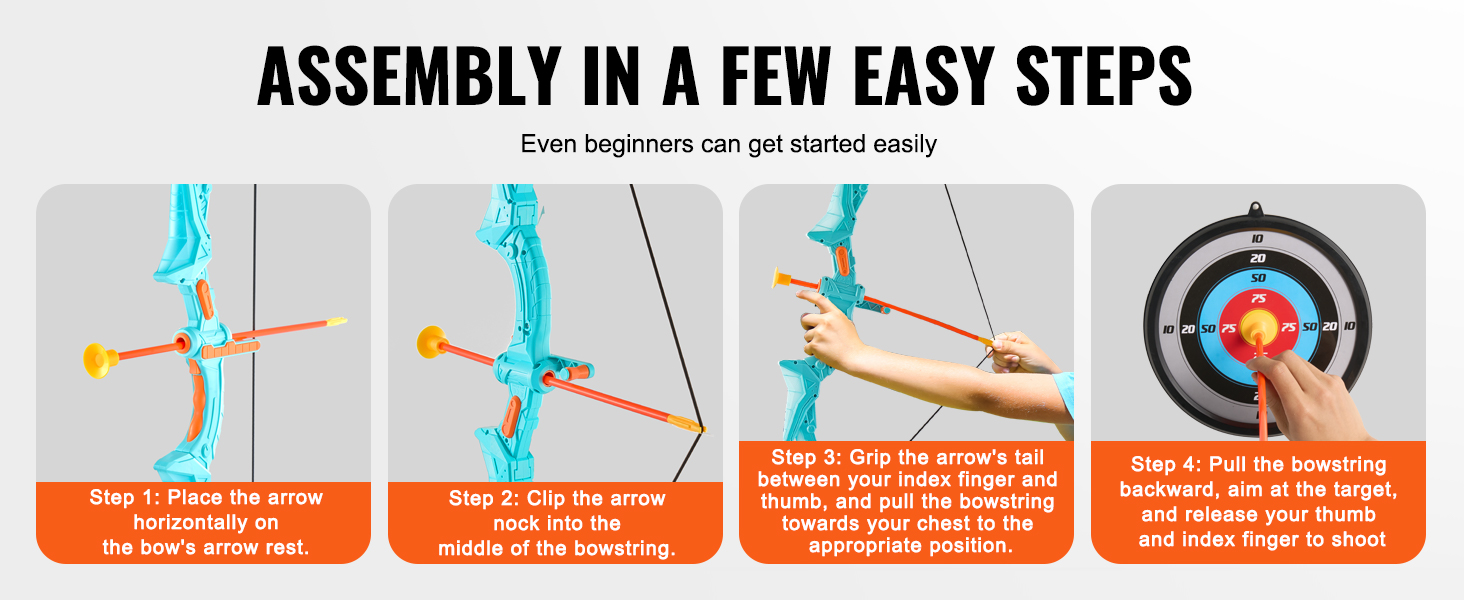 Detská lukostrelecká súprava sa veľmi ľahko používa, dokonca aj pre začiatočníkov! Stačí len niekoľko jednoduchých krokov a môžete začať. Tak zhromaždite celú rodinu a užite si okamžitú zábavu a čas na zblíženie!