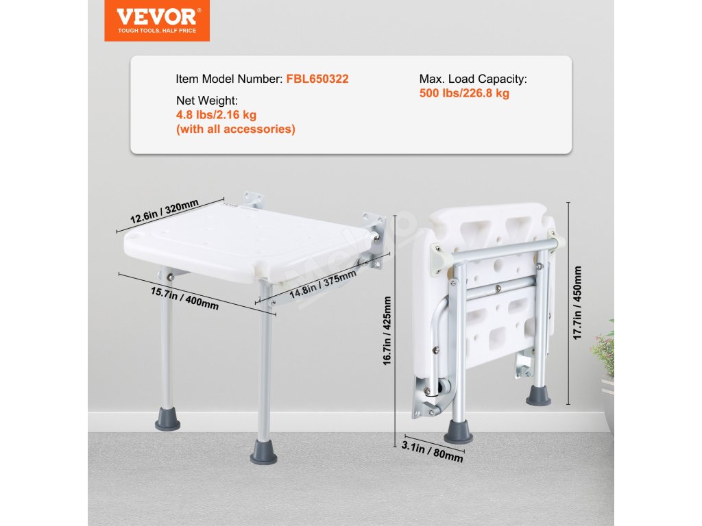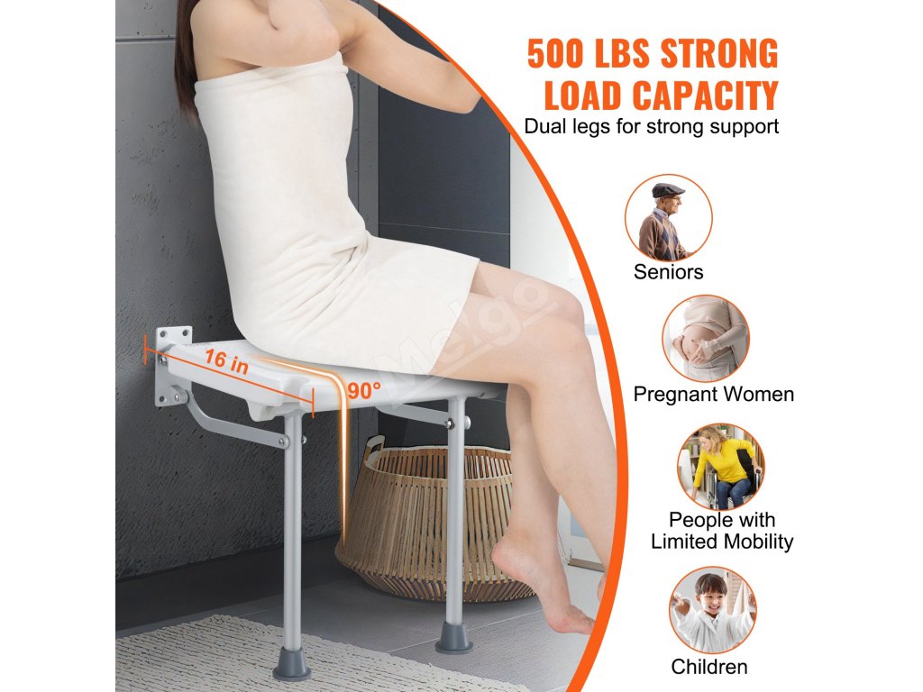 Nástenné skladacie pe sprchové sedadlo 15.7''×14.8'', nosnosť 500 lbs