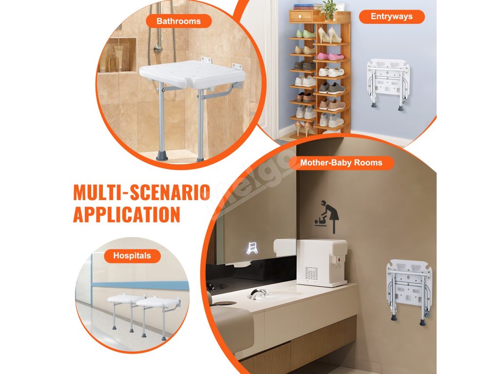Vďaka elegantnému a štýlovému dizajnu sa toto nástenné sprchové sedadlo bez problémov hodí do rôznych štýlov interiéru a prostredí. Ideálne sa hodí do kúpeľní, spální, predsiení, vchodov a lodí, ponúka bezkonkurenčné pohodlie a zvyšuje funkčnosť každého priestoru.
