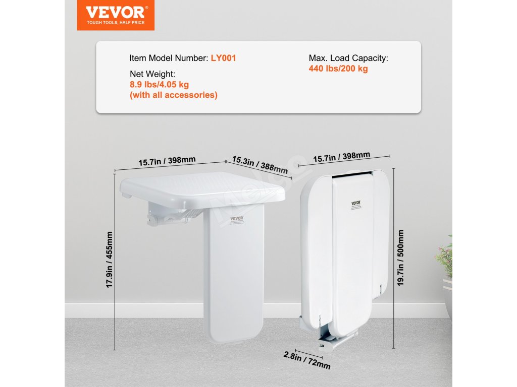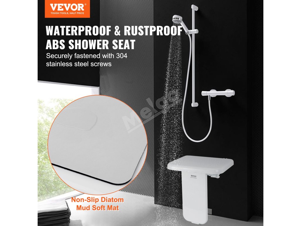 Sprchové sklopné sedátko z ABS na stenu, 15.7''×16.7'', nosnosť 440 lbs