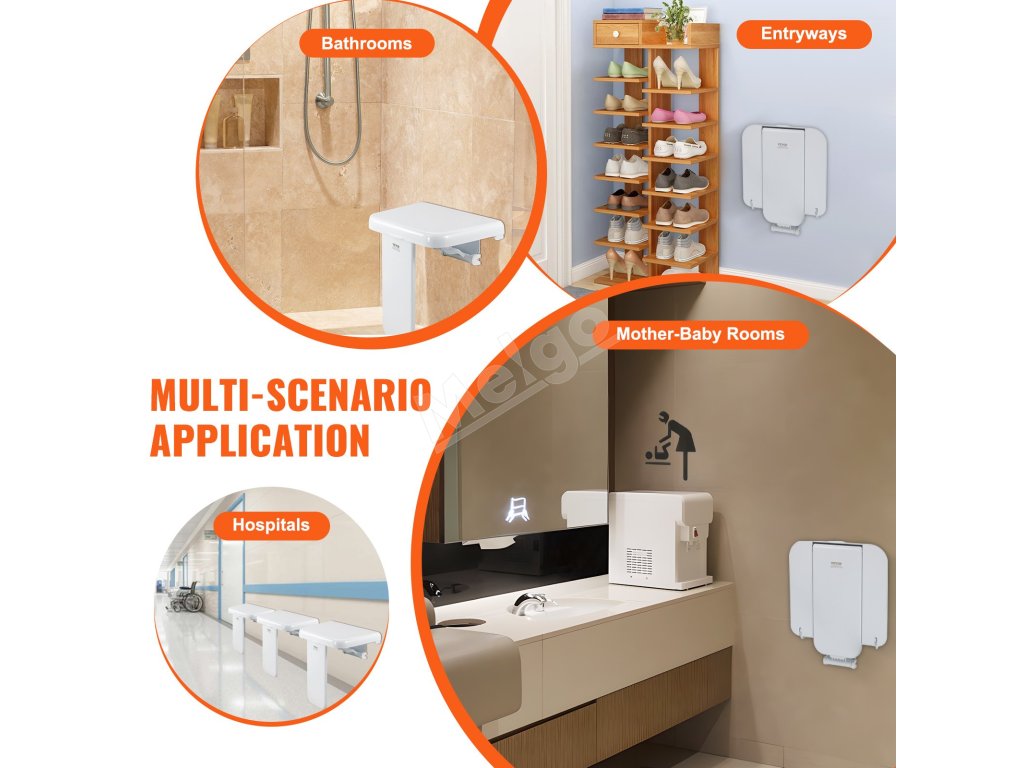 Vďaka elegantnému a štýlovému dizajnu sa toto nástenné sprchové sedadlo bez problémov hodí do rôznych štýlov interiéru a prostredí. Ideálne sa hodí do kúpeľní, spální, predsiení, vchodov a lodí, ponúka bezkonkurenčné pohodlie a zvyšuje funkčnosť každého priestoru.