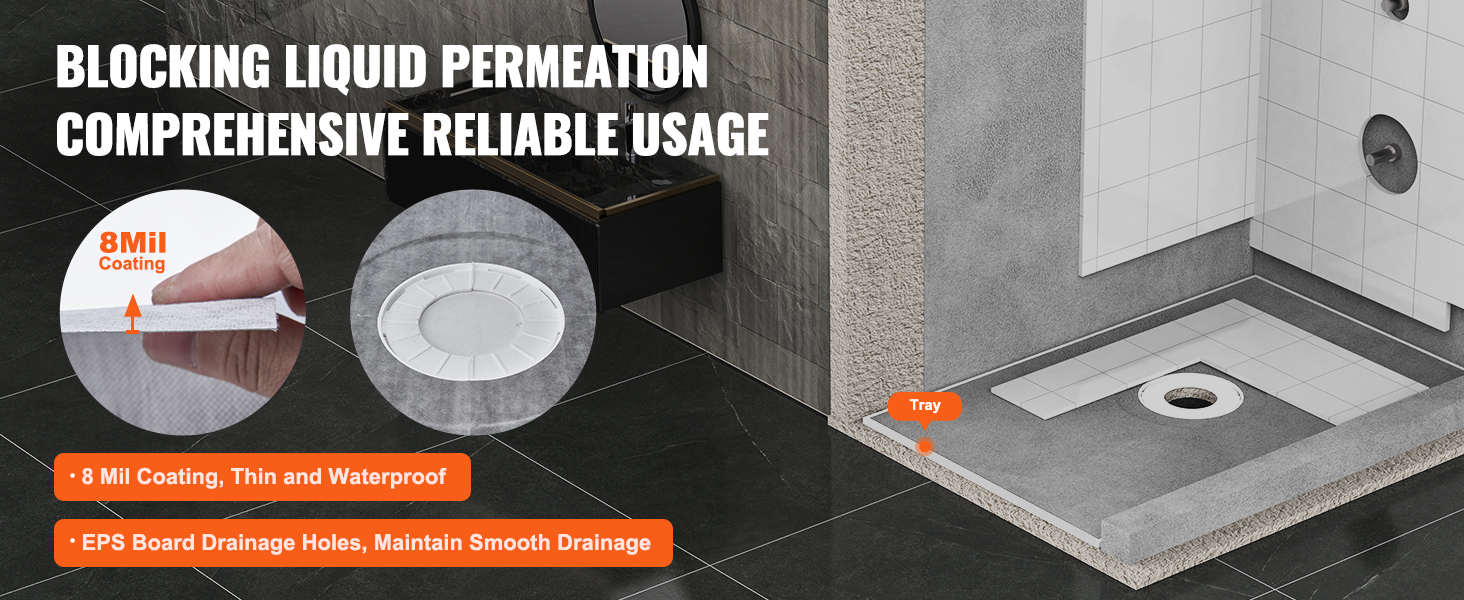 Sprchová vanička obsahuje 8-milovú fóliu a elegantný vodotesný dizajn, ktorý účinne zabraňuje prenikaniu kvapaliny. Doska EPS pomáha udržiavať svieže a zdravé prostredie v sprchovacom priestore, vďaka čomu si môžete naplno užívať sprchovanie.
