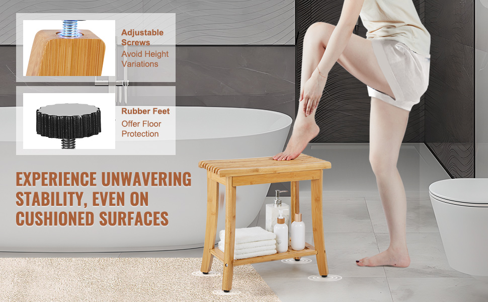 Naše sedadlo kúpeľňovej lavice sa bez námahy prispôsobí nerovnej podlahe. Pomocou skrutiek z nehrdzavejúcej ocele ľahko nastavíte výšku, čím zabezpečíte stabilitu a odolnosť proti hrdzi aj na mierne šikmých povrchoch. Gumové nožičky navyše zlepšujú priľnavosť bez toho, aby poškriabali podlahu.