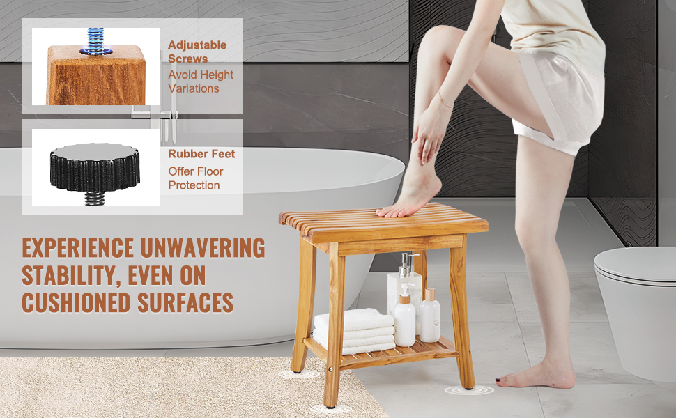 Naše sedadlo kúpeľňovej lavice sa bez námahy prispôsobí nerovnej podlahe. Pomocou skrutiek z nehrdzavejúcej ocele ľahko nastavíte výšku, čím zabezpečíte stabilitu a odolnosť proti hrdzi aj na mierne šikmých povrchoch. Gumové nožičky navyše zlepšujú priľnavosť bez toho, aby poškriabali podlahu.