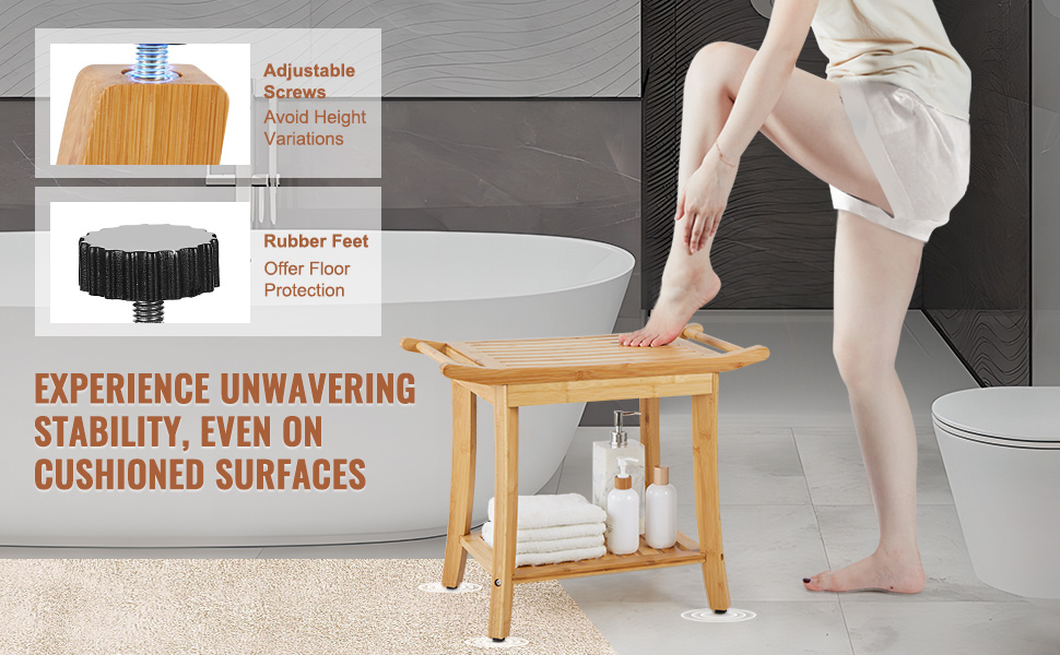 Naše sedadlo kúpeľňovej lavice sa bez námahy prispôsobí nerovnej podlahe. Pomocou skrutiek z nehrdzavejúcej ocele ľahko nastavíte výšku, čo zaručuje stabilitu a odolnosť proti hrdzi aj na mierne šikmých povrchoch. Gumové nožičky navyše zlepšujú priľnavosť bez toho, aby poškriabali podlahu.