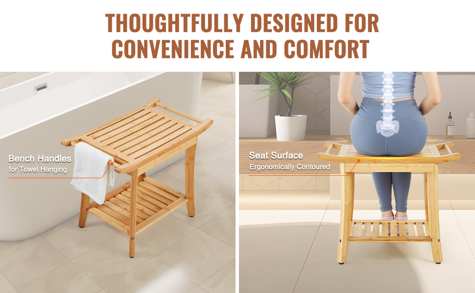 Naša lavica do sprchy z bambusového dreva, vylepšená dvojitými rukoväťami na jednoduché premiestňovanie a zavesenie uterákov, má jemne tvarované sedadlo na pohodlné sedenie.