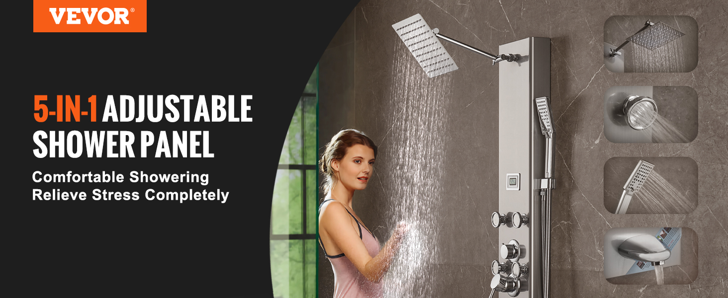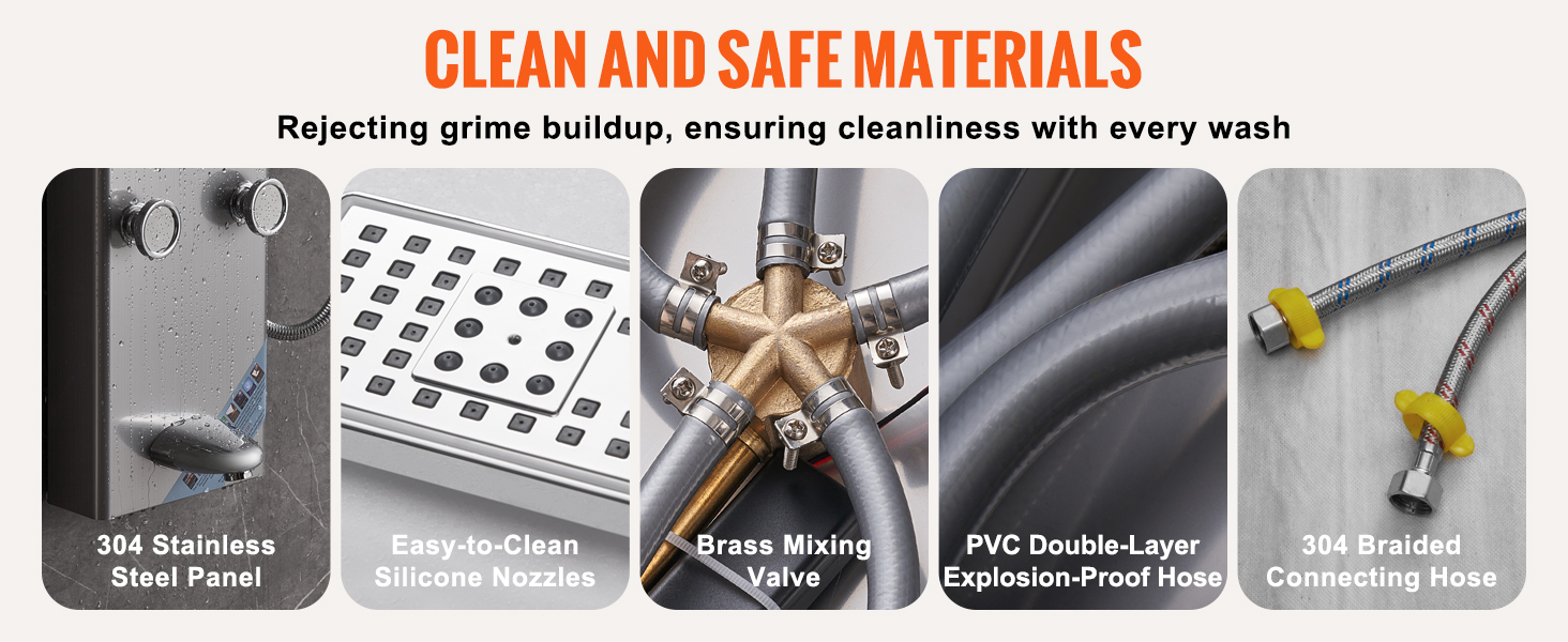 Náš sprchovací panel je vyrobený zo zosilneného panelu z nehrdzavejúcej ocele 304, ktorý zaručuje odolnosť a hygienu, odoláva korózii a ľahko sa čistí. Mosadzný zmiešavací ventil na vodu a dvojitá nevýbušná rúrka z PVC spolu s opletenou tryskou z nehrdzavejúcej ocele 304 zabezpečujú robustný a nepriepustný systém.