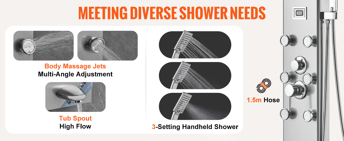 Naše masážne trysky sú navrhnuté tak, aby nedochádzalo k priamemu dopadu na tvár. Uhol trysiek možno nastaviť tak, aby sa prispôsobil rôznym výškam používateľov. Sprchová hlavica s 3 nastaveniami a 59 palcovou/1,5 m dlhou trubicou je univerzálna na čistenie kúpeľne, sprchovanie alebo kúpanie domácich zvierat.