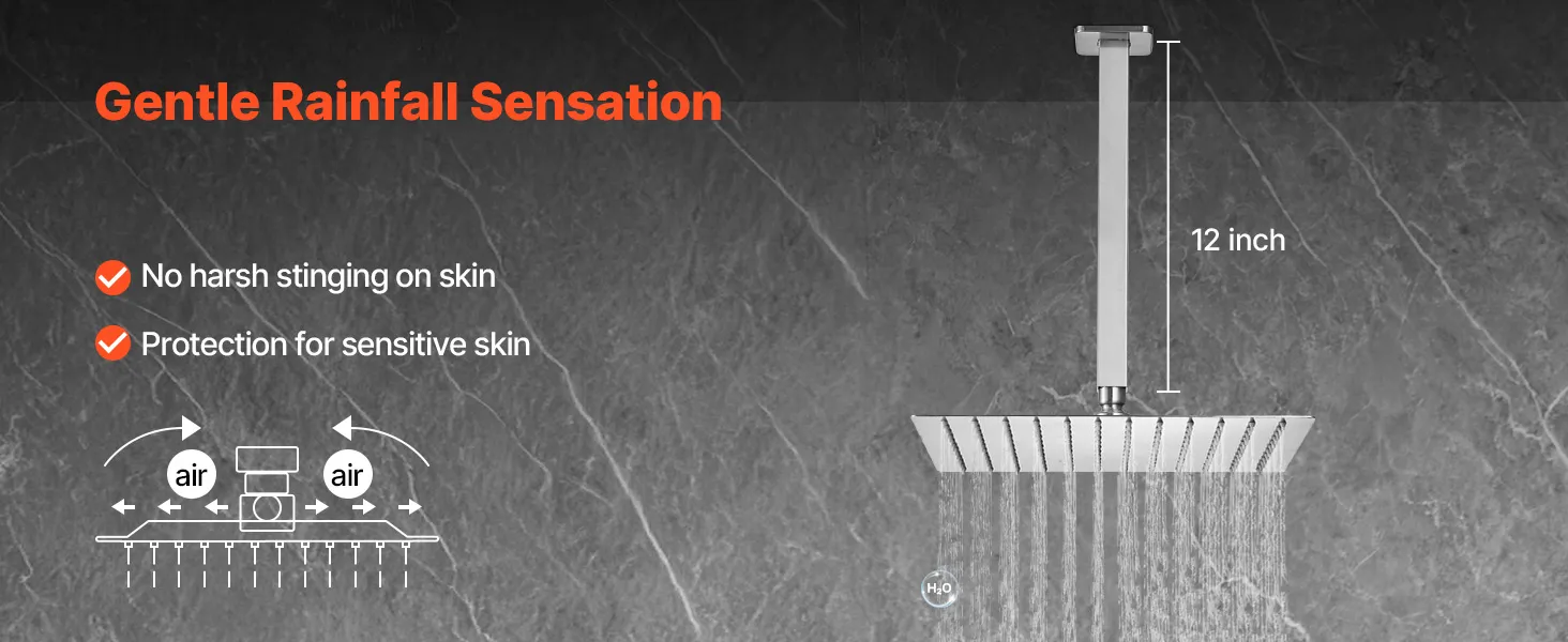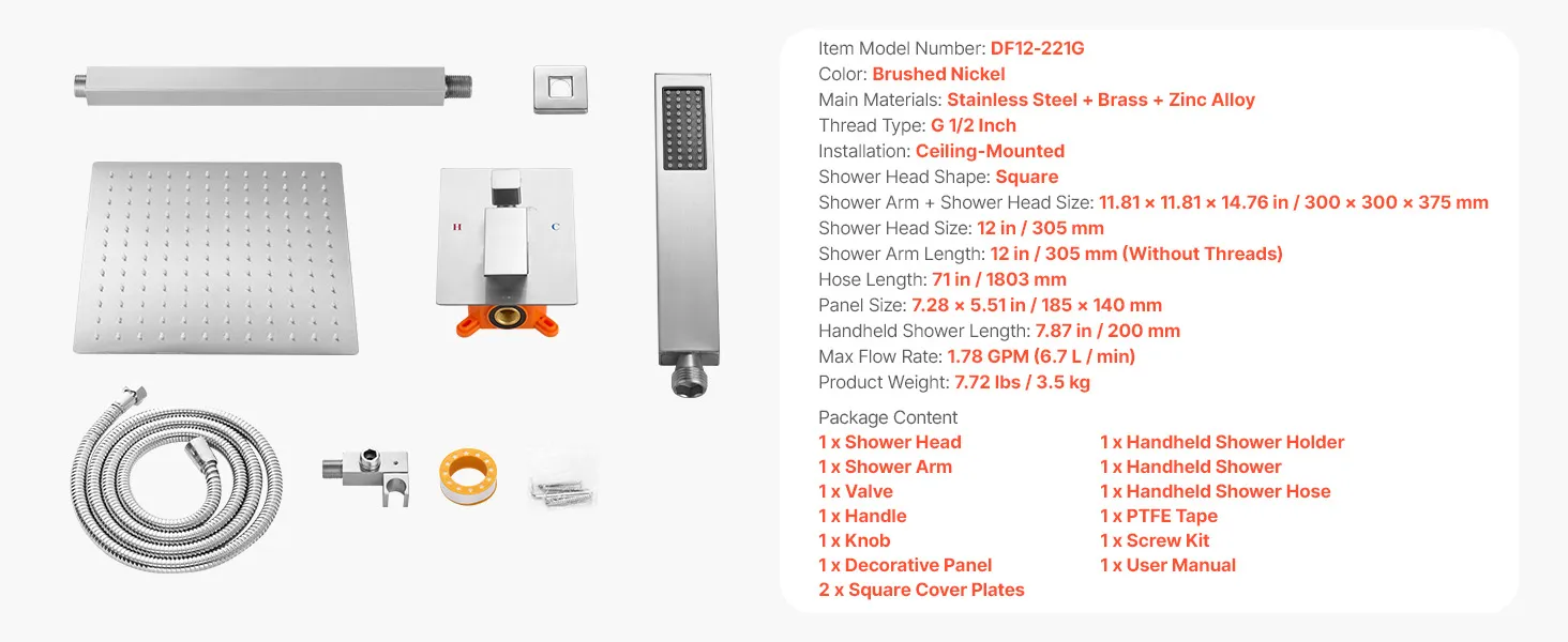 | Veľkosť sprchového ramena + sprchovej hlavice | 11.81 x 11,81 x 14,76 in/300 x 300 x 375 mm |