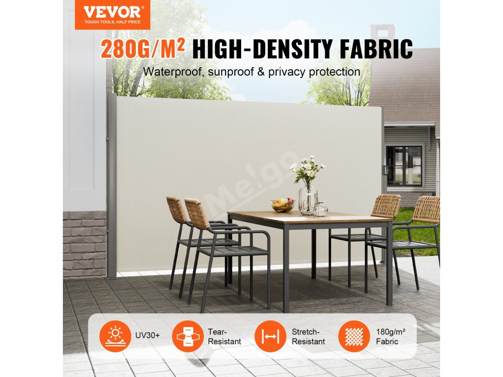 Bočná markíza je vybavená polyesterovou tkaninou s vysokou hustotou 280 g/m² a robustnou PU vrstvou, ktorá poskytuje vynikajúce vodotesné vlastnosti a pevnosť v ťahu. Vďaka úrovni ochrany UV30+ chráni vás a vašu rodinu pred UV žiarením. Užívajte si pobyt vonku bez obáv o počasie!