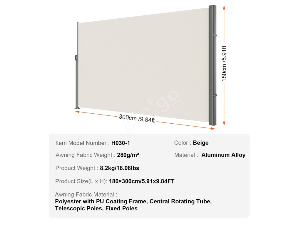 Bočná markíza je vybavená polyesterovou tkaninou s vysokou hustotou 280 g/m² s robustnou PU povrchovou úpravou, ktorá poskytuje vynikajúci vodotesný výkon a pevnosť v ťahu. Vďaka úrovni ochrany UV30+ chráni vás a vašu rodinu pred UV žiarením. Užívajte si pobyt vonku bez obáv o počasie!