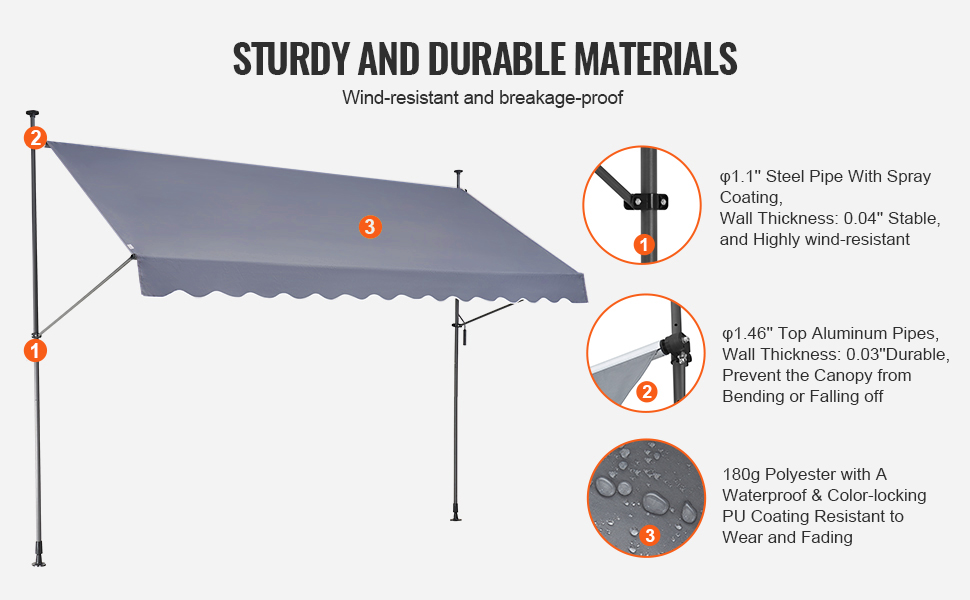 180g vodotesný PU povlak s uzamykateľnou farbou na tejto výsuvnej markíze na terasu ponúka ochranu proti UV žiareniu s hodnotami UV82+, vďaka čomu je táto markíza ideálna na relaxáciu na terase.