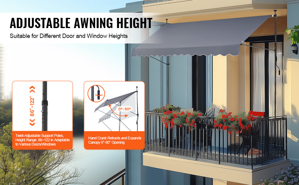 Vďaka otočnej nosnej tyči umožňuje táto ručne výsuvná markíza výškové nastavenie, aby sa prispôsobila rôznym veľkostiam dverí a okien, čo zvyšuje všestrannosť markíz na terasu.
