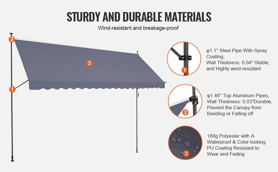180g vodotesný PU povlak s uzamykateľnou farbou na tejto výsuvnej markíze na terasu ponúka ochranu proti UV žiareniu s hodnotami UV84+, vďaka čomu je táto markíza ideálna na relaxáciu na terase.