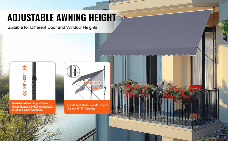 Vďaka otočnej nosnej tyči umožňuje táto ručne výsuvná markíza výškové nastavenie, aby sa prispôsobila rôznym veľkostiam dverí a okien, čo zvyšuje všestrannosť markíz na terasu.