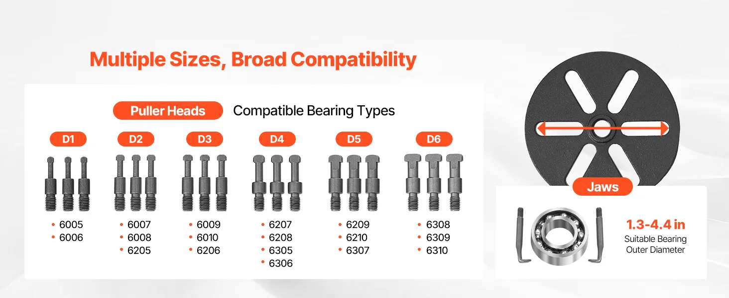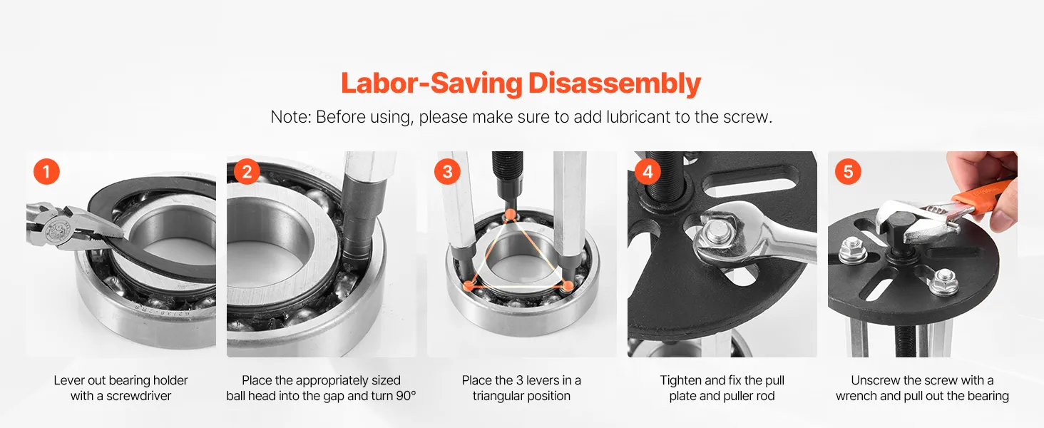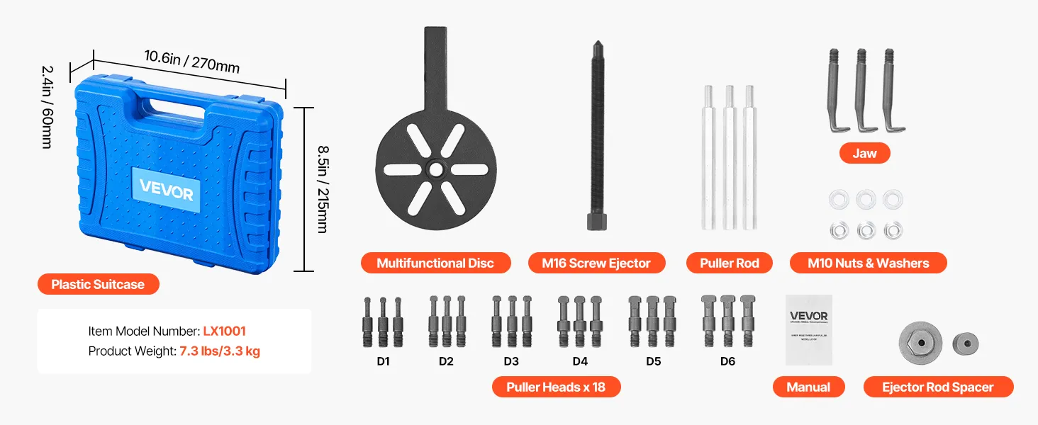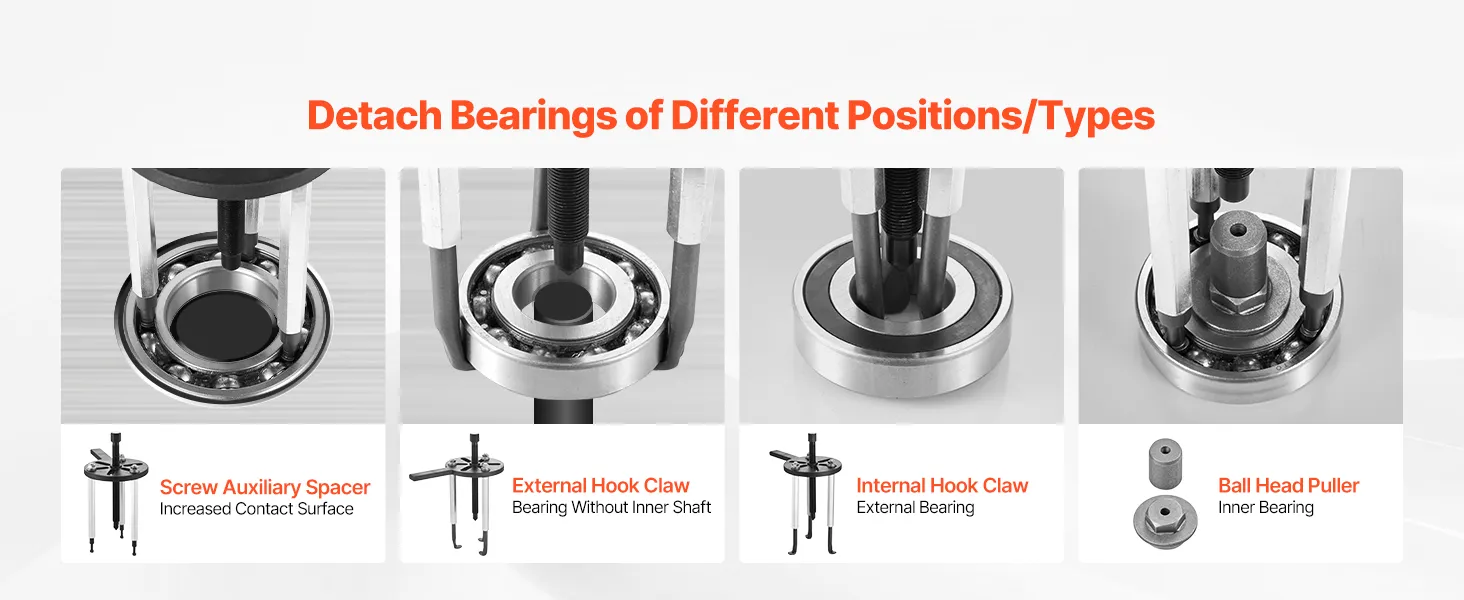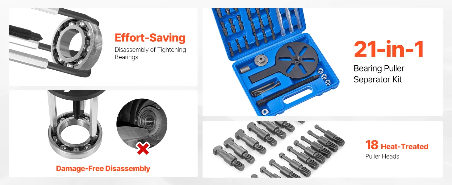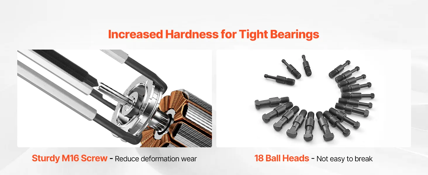 Táto súprava na sťahovanie ložísk je vybavená pomocnými dištančnými podložkami skrutiek, ktoré rozširujú kontaktnú plochu skrutky a pomáhajú vám efektívnejšie sťahovať ložiská.