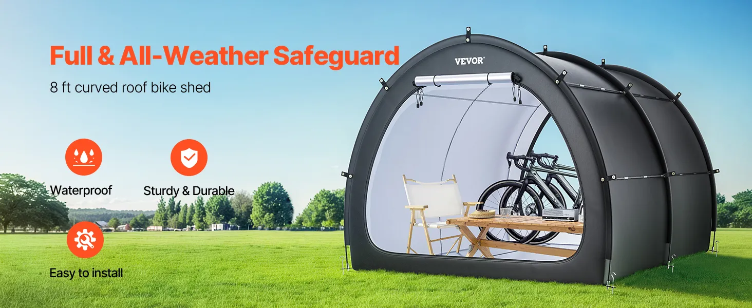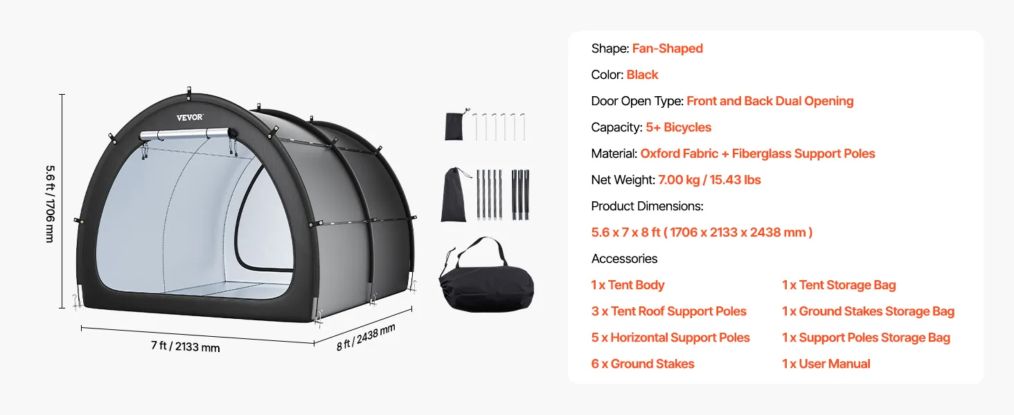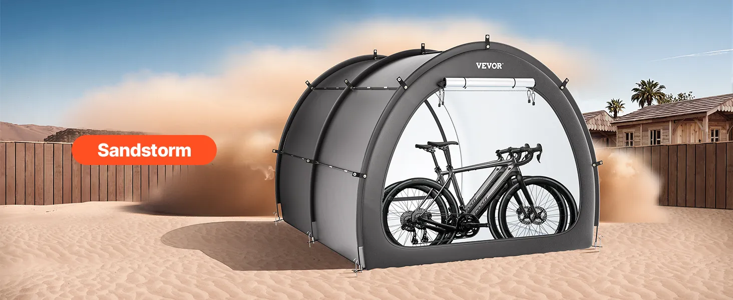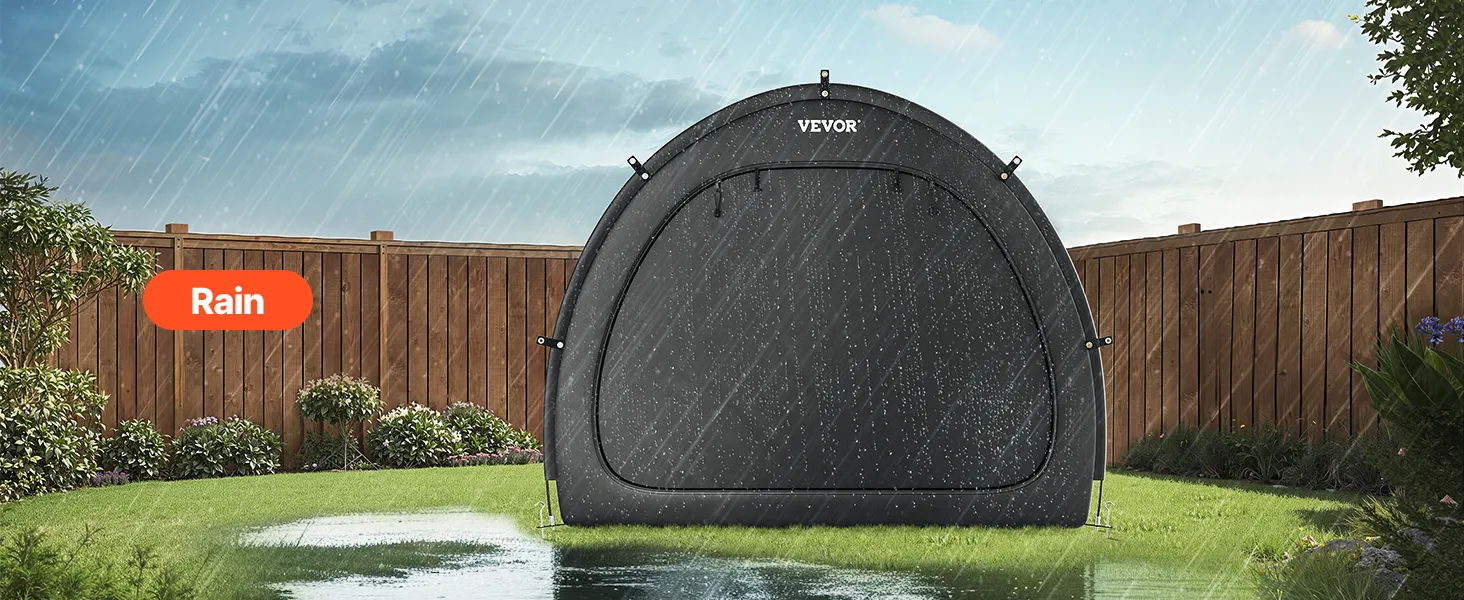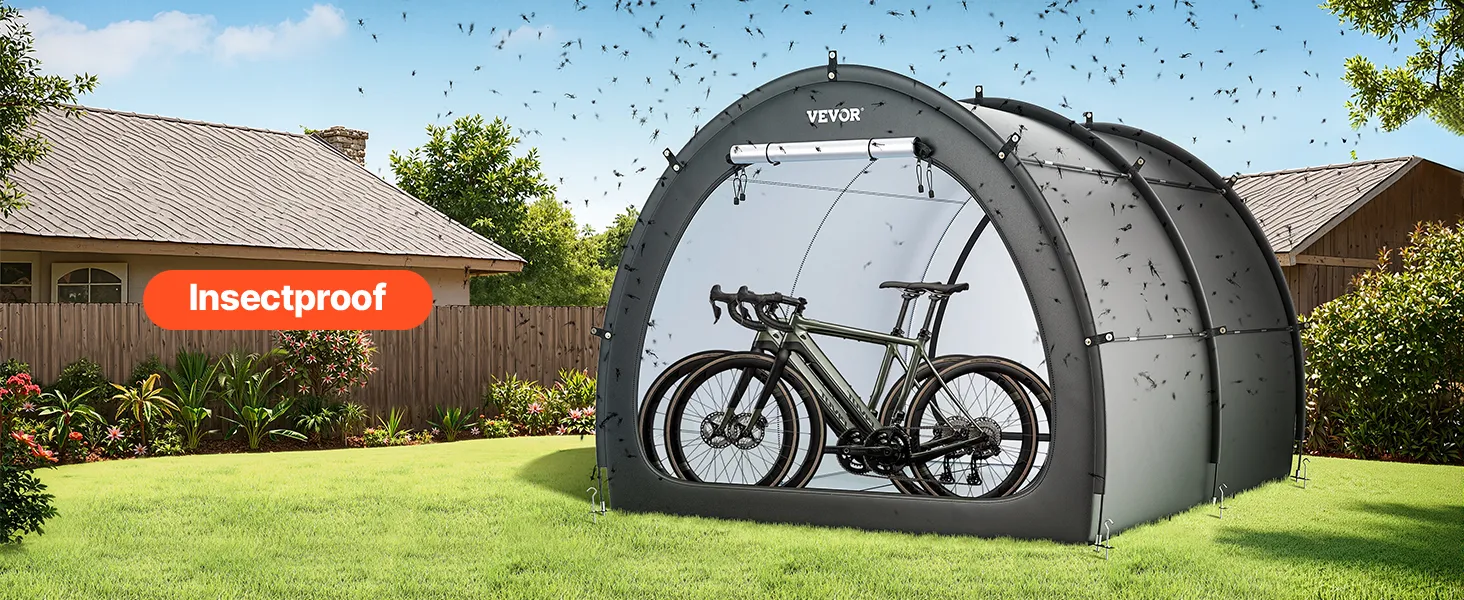 Náš prístrešok na bicykel je vybavený dvojvrstvovou vodotesnou vrstvou a tkaninou Oxford 210D so striebornou vrstvou, ktorá zaručuje odolnosť. Robustný rám zo sklených vlákien zaisťuje stabilitu, zatiaľ čo jeho ľahká konštrukcia umožňuje rýchle nastavenie. Vetracie okná udržiavajú interiér v suchu a sviežosti.