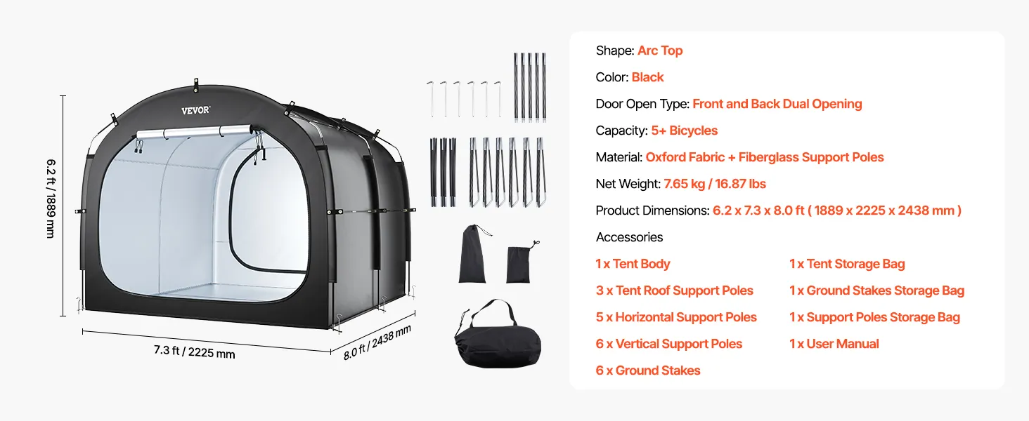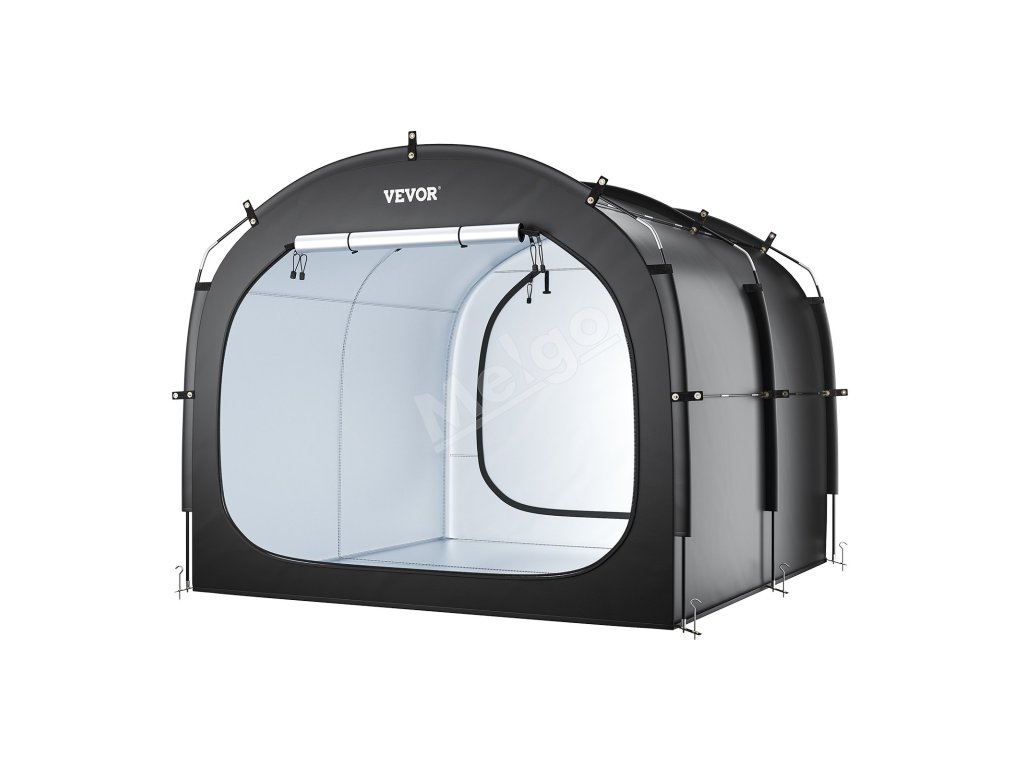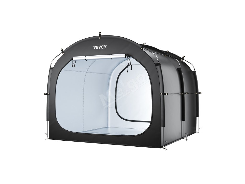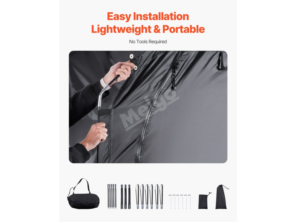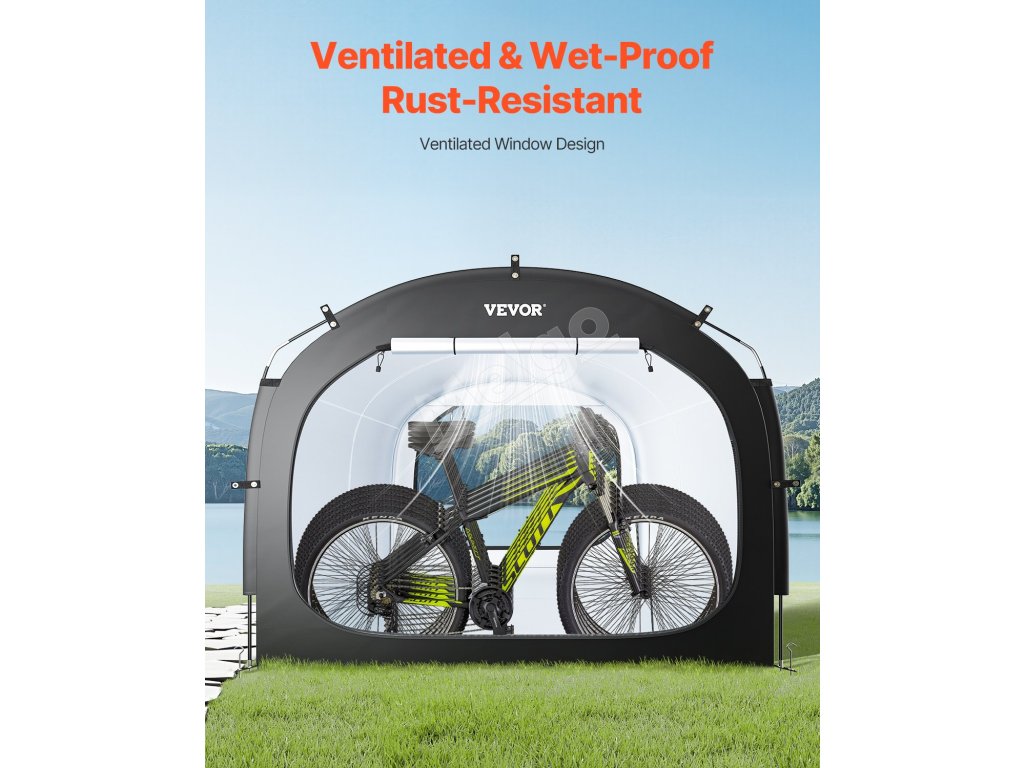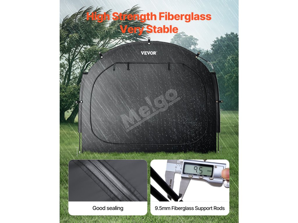 Náš prístrešok na bicykel je vybavený dvojvrstvovou vodotesnou vrstvou a tkaninou Oxford 210D so striebornou vrstvou, ktorá zaručuje odolnosť. Robustný rám zo sklených vlákien zaisťuje stabilitu, zatiaľ čo jeho ľahká konštrukcia umožňuje rýchle nastavenie. Vetracie okná udržiavajú interiér v suchu a sviežosti.