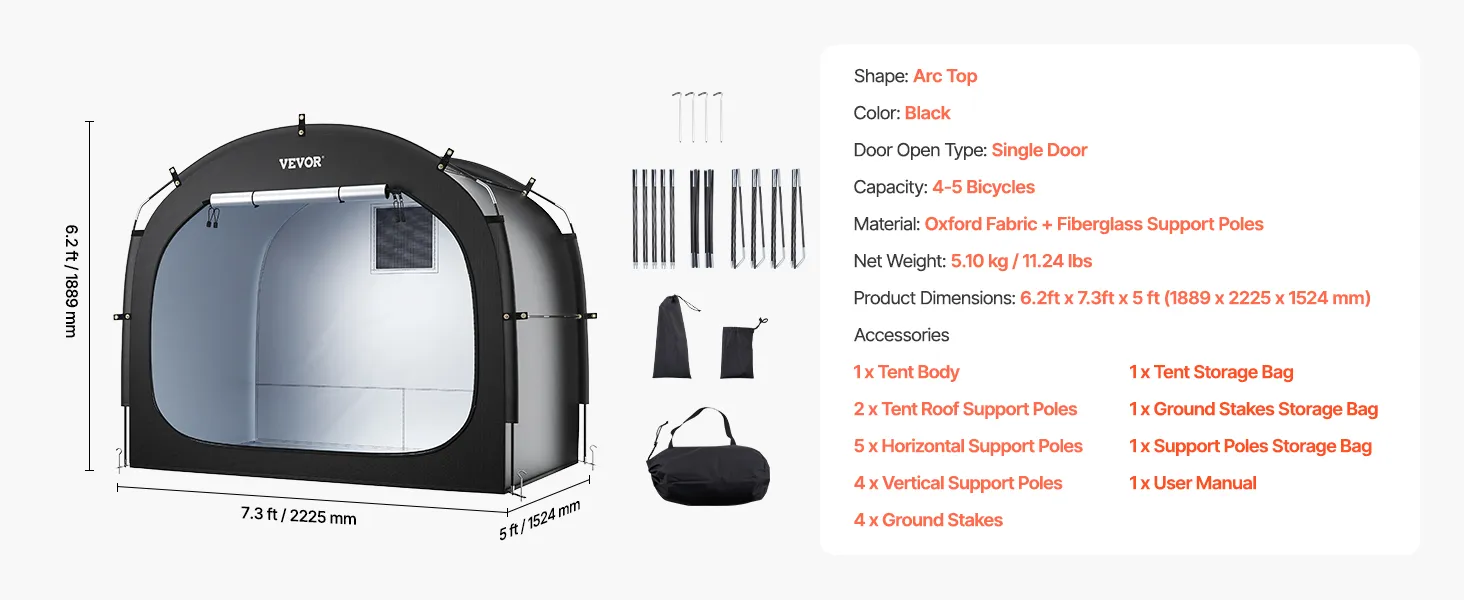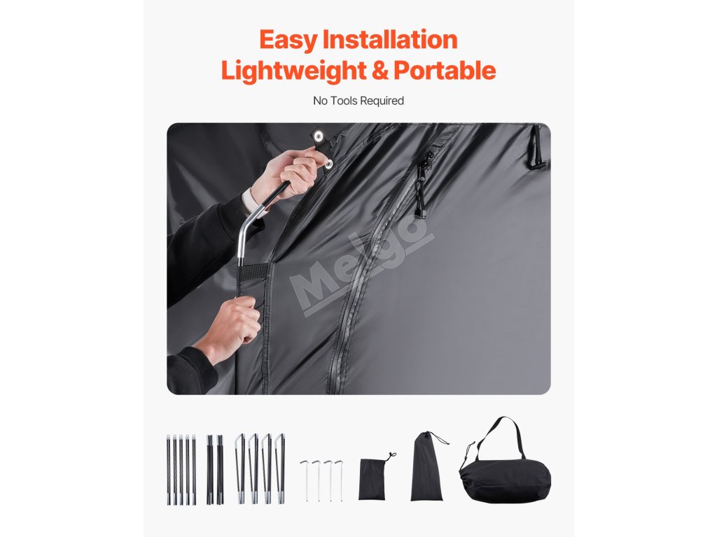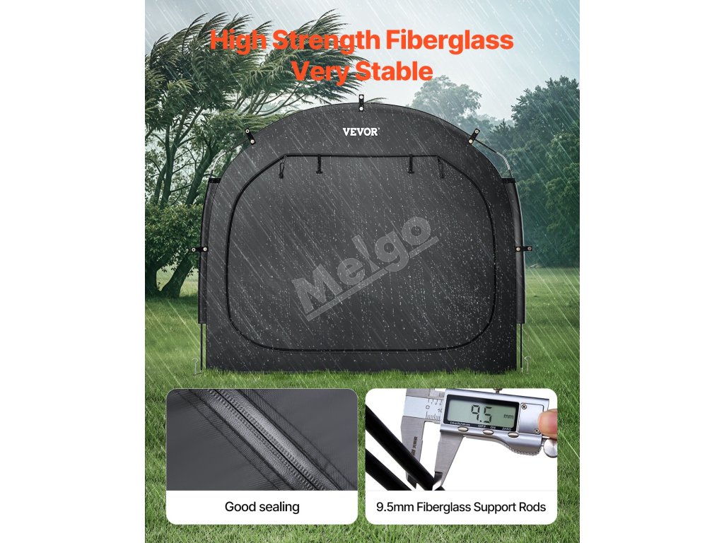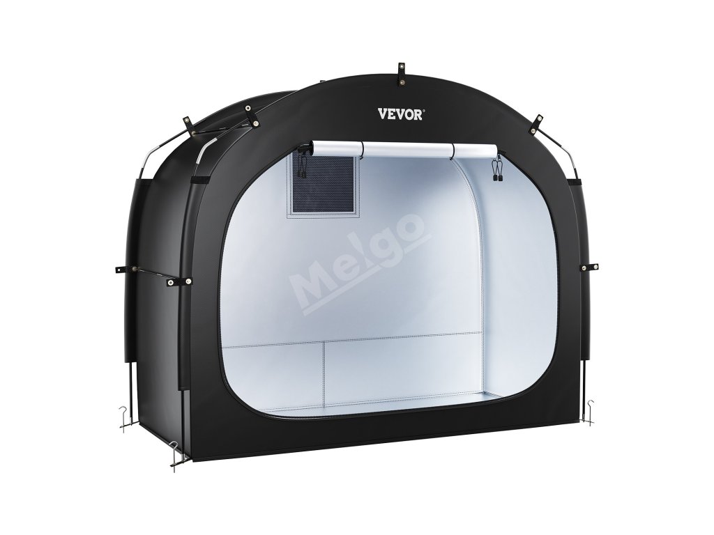 Náš prístrešok na bicykel je vybavený dvojvrstvovou vodotesnou vrstvou a tkaninou Oxford 210D so striebornou vrstvou, ktorá zaručuje odolnosť. Robustný rám zo sklených vlákien zaisťuje stabilitu, zatiaľ čo jeho ľahká konštrukcia umožňuje rýchle nastavenie. Vetracie okná udržiavajú interiér v suchu a sviežosti.