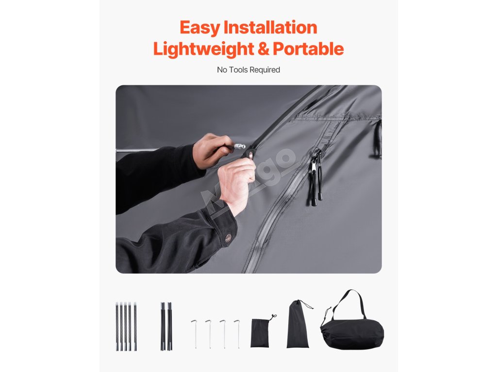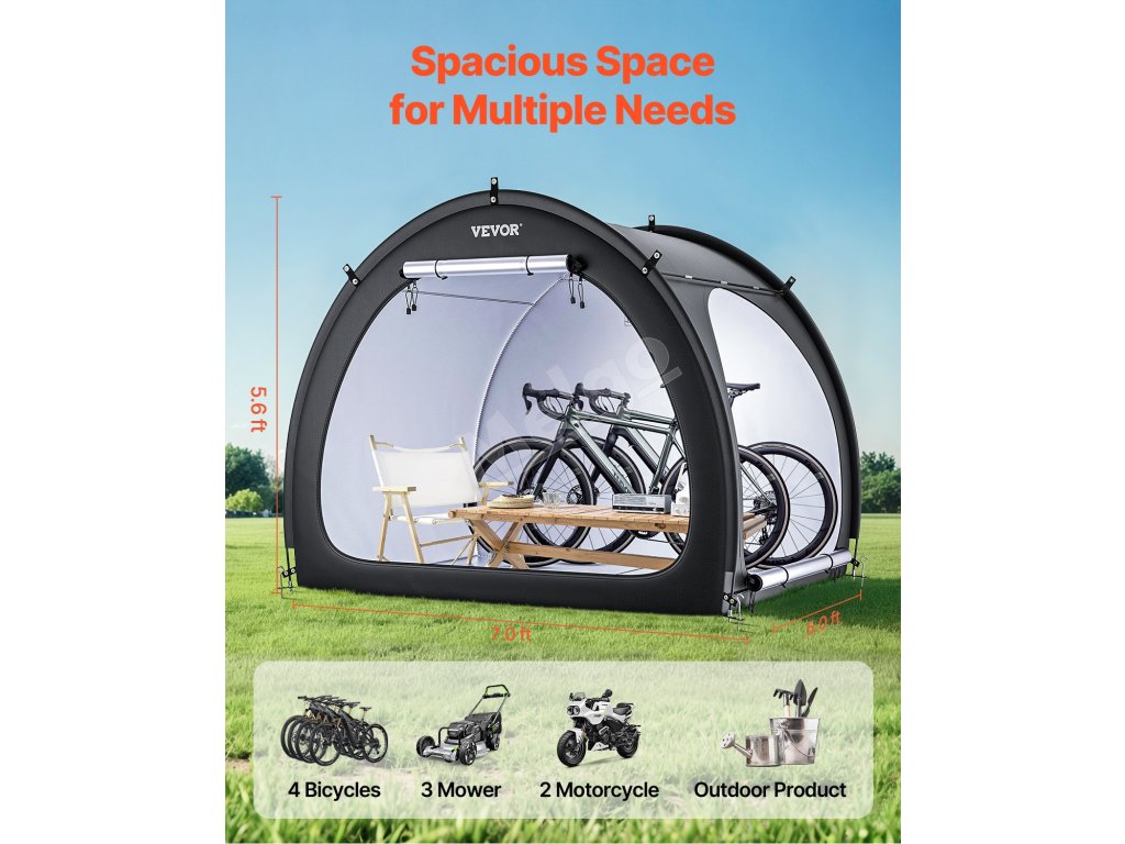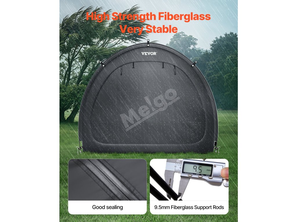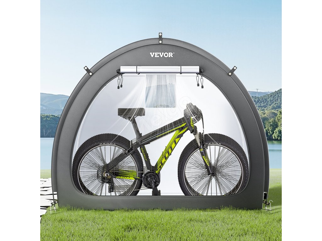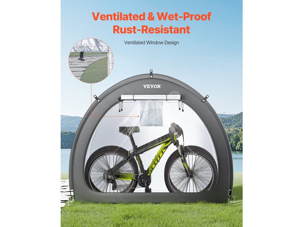Náš prístrešok na bicykel je vybavený dvojvrstvovou vodotesnou vrstvou a tkaninou Oxford 210D so striebornou povrchovou úpravou, ktorá zaručuje odolnosť. Robustný rám zo sklených vlákien zaisťuje stabilitu, zatiaľ čo jeho ľahká konštrukcia umožňuje rýchle nastavenie. Vetracie okná udržiavajú interiér v suchu a sviežosti.